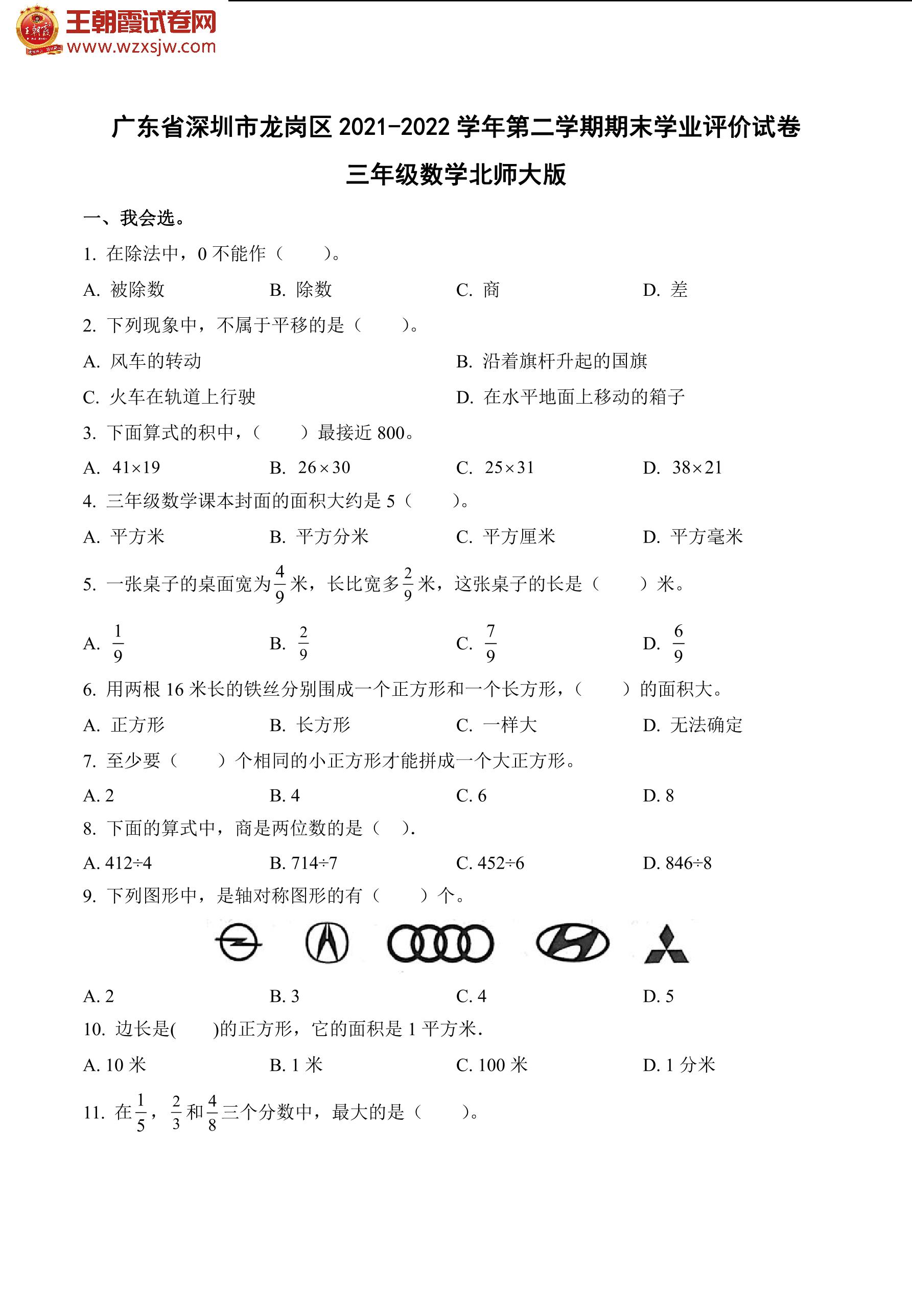广东省深圳市龙岗区2021-2022学年第二学期期末学业评价试卷三年级数学(北师版)