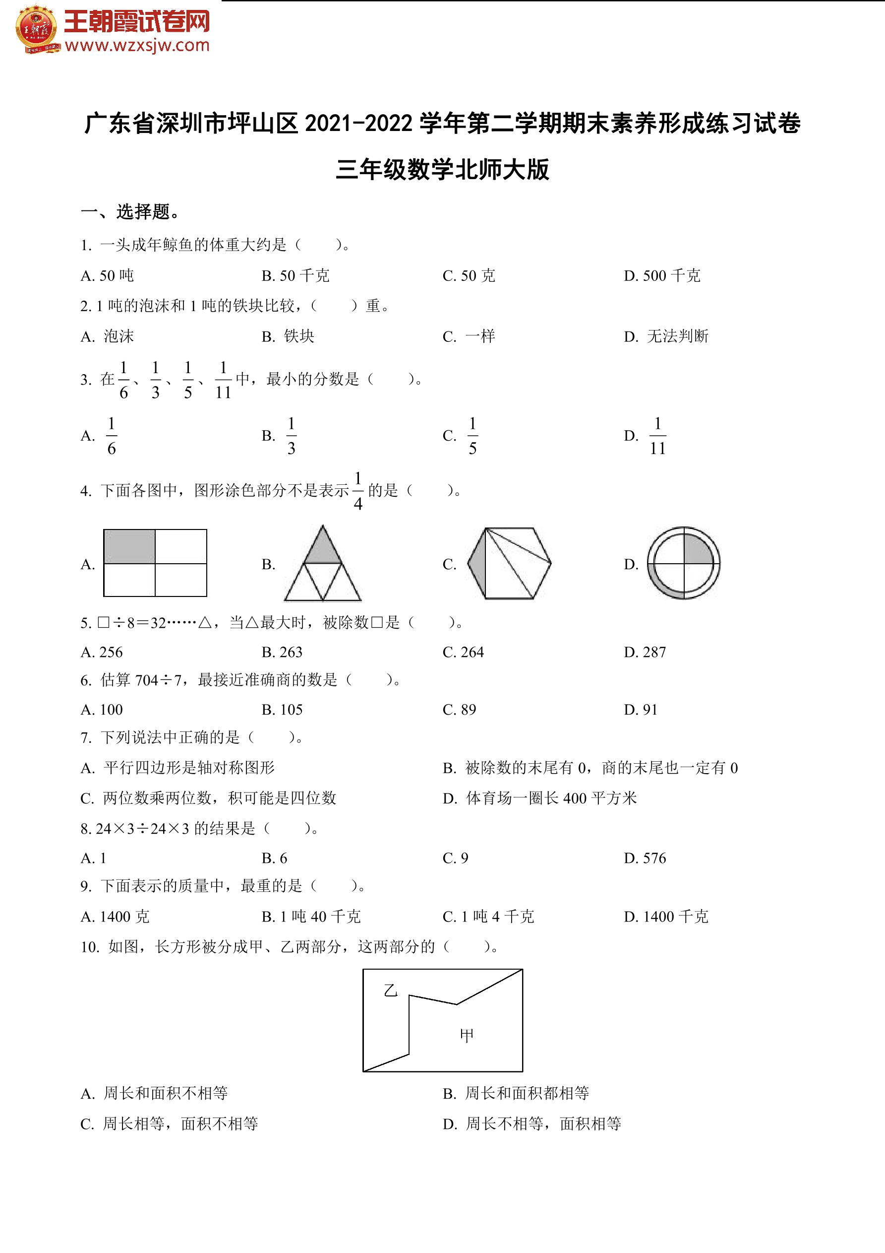 广东省深圳市坪山区2021-2022学年第二学期期末素养形成练习试卷三年级数学(北师版)