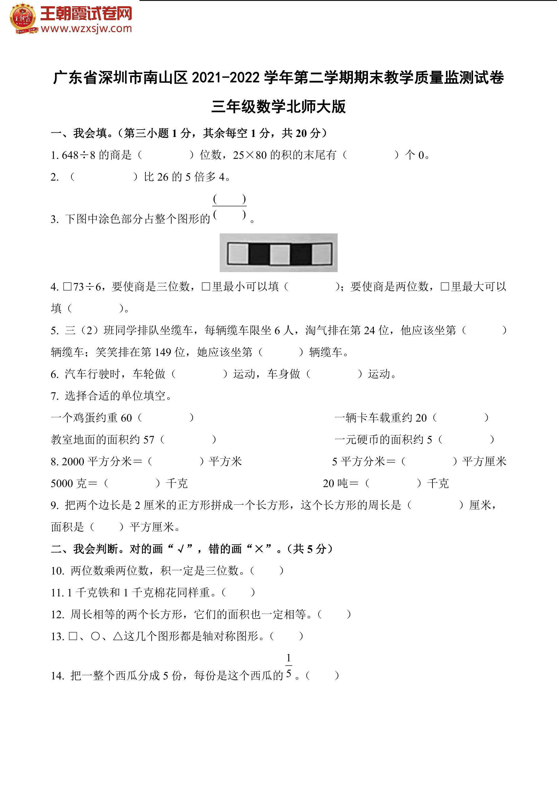 广东省深圳市南山区2021-2022学年第二学期期末教学质量监测试卷三年级数学(北师版)