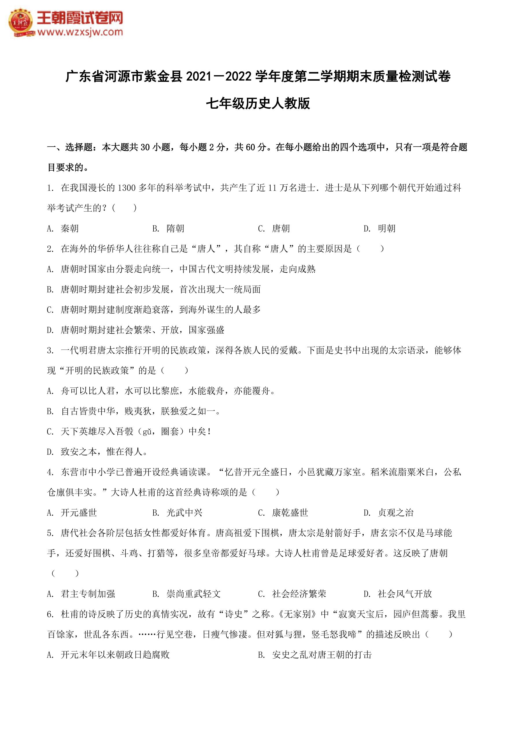 广东省河源市紫金县2021-2022学年度第二学期期末质量检测试卷七年级历史(人教版)