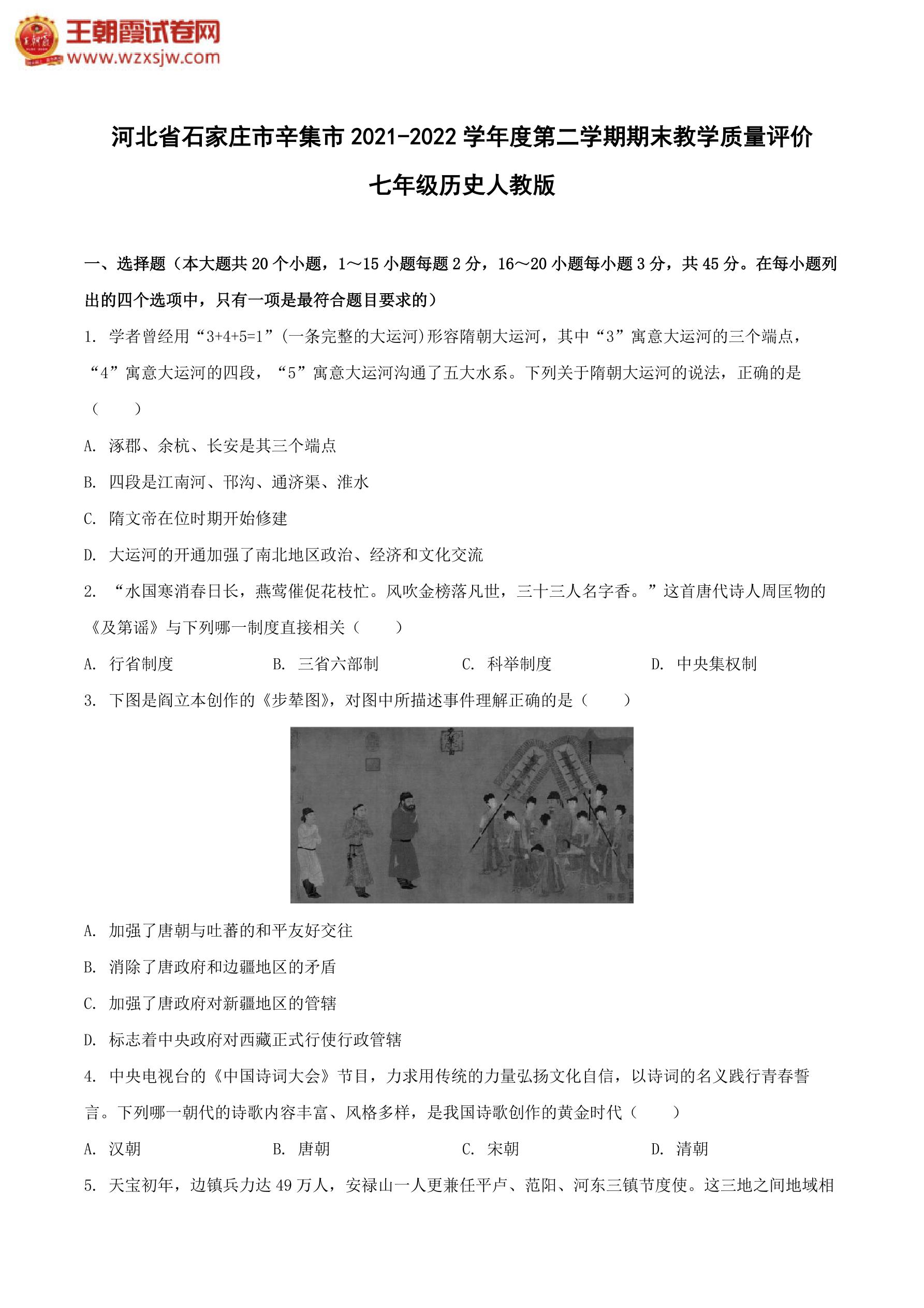 河北省石家庄市辛集市2021-2022学年度第二学期期末教学质量评价七年级历史(人教版)