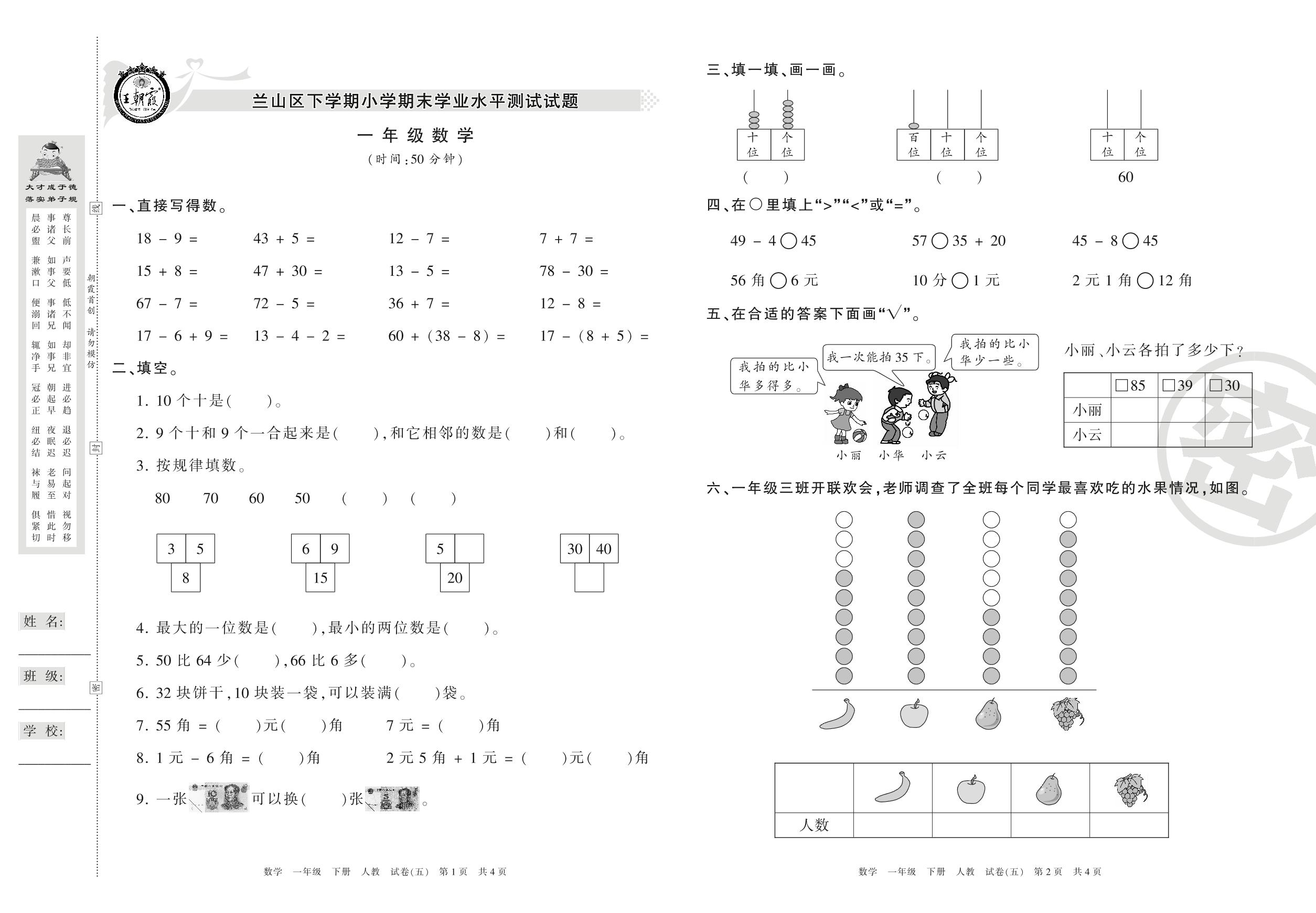 2015-2016学年第二学期临沂市兰山区一年级数学试卷(人教版)【5】
