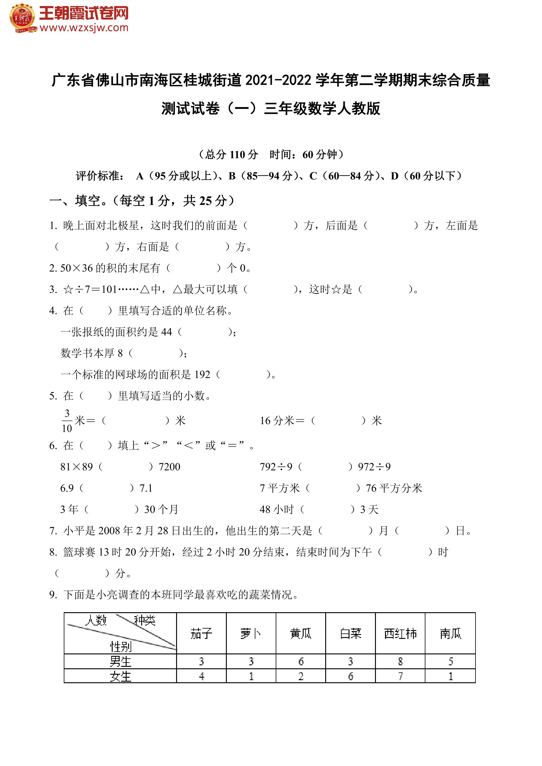 广东省佛山市南海区桂城街道2021-2022学年第二学期期末综合质量测试试卷(一)三年级数学(人教版)