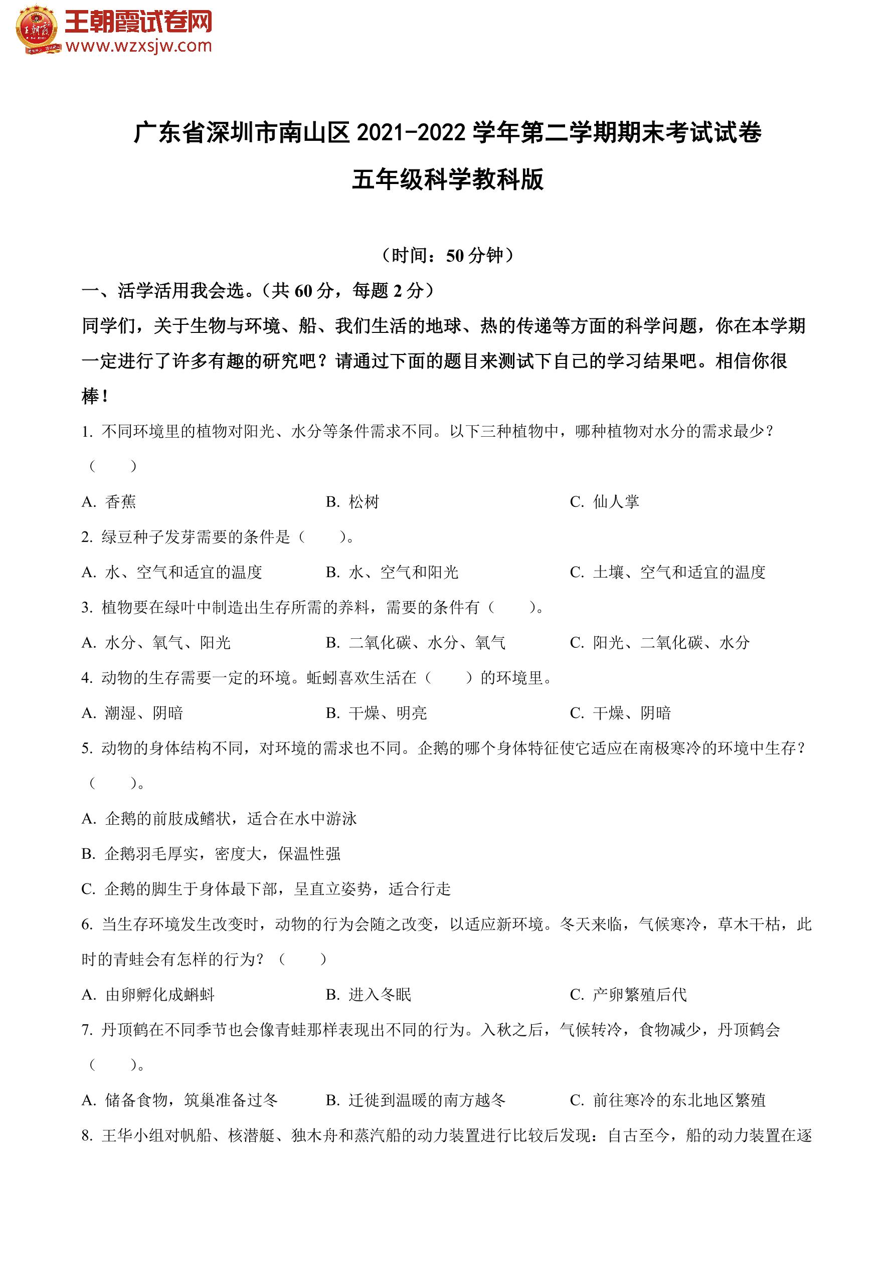广东省深圳市南山区2021-2022学年第二学期期末考试试卷五年级科学(教科版)
