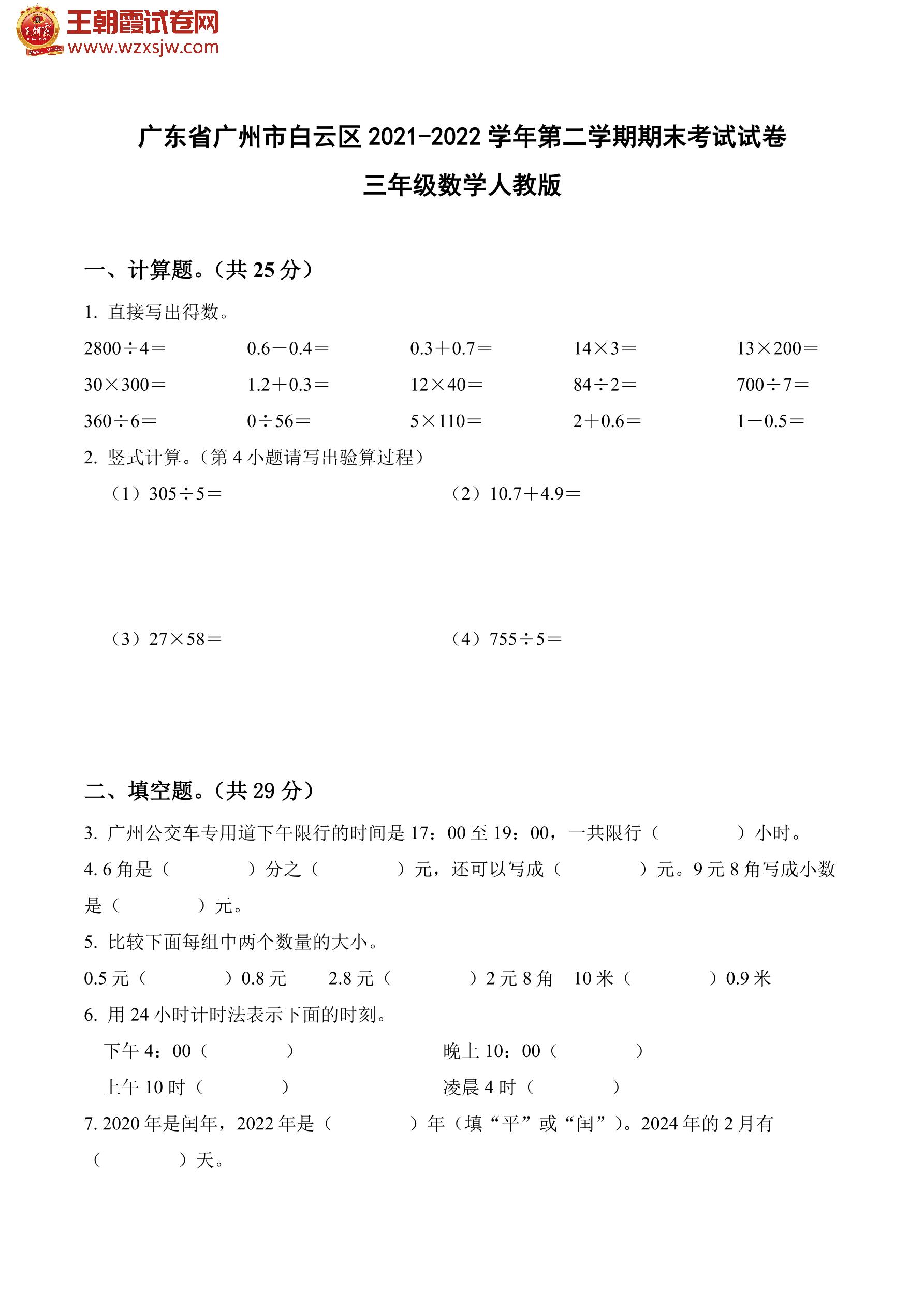 广东省广州市白云区2021-2022学年第二学期期末考试试卷三年级数学(人教版)