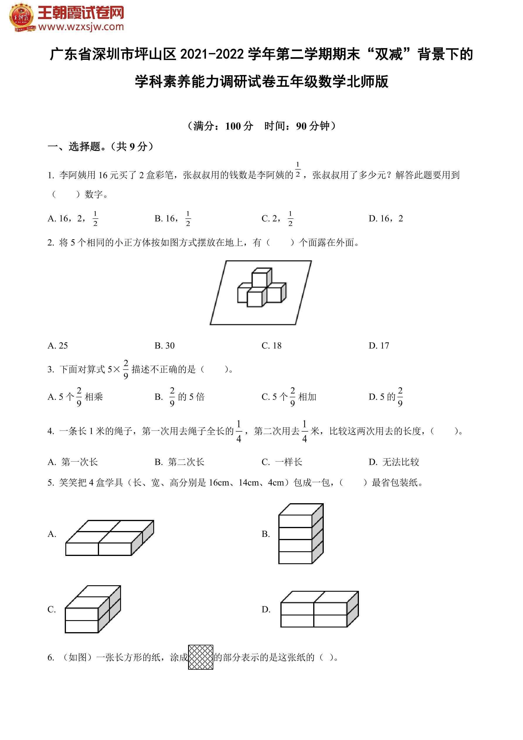 广东省深圳市坪山区2021-2022学年第二学期期末“双减”背景下的学科素养能力调研试卷五年级数学(北师版)