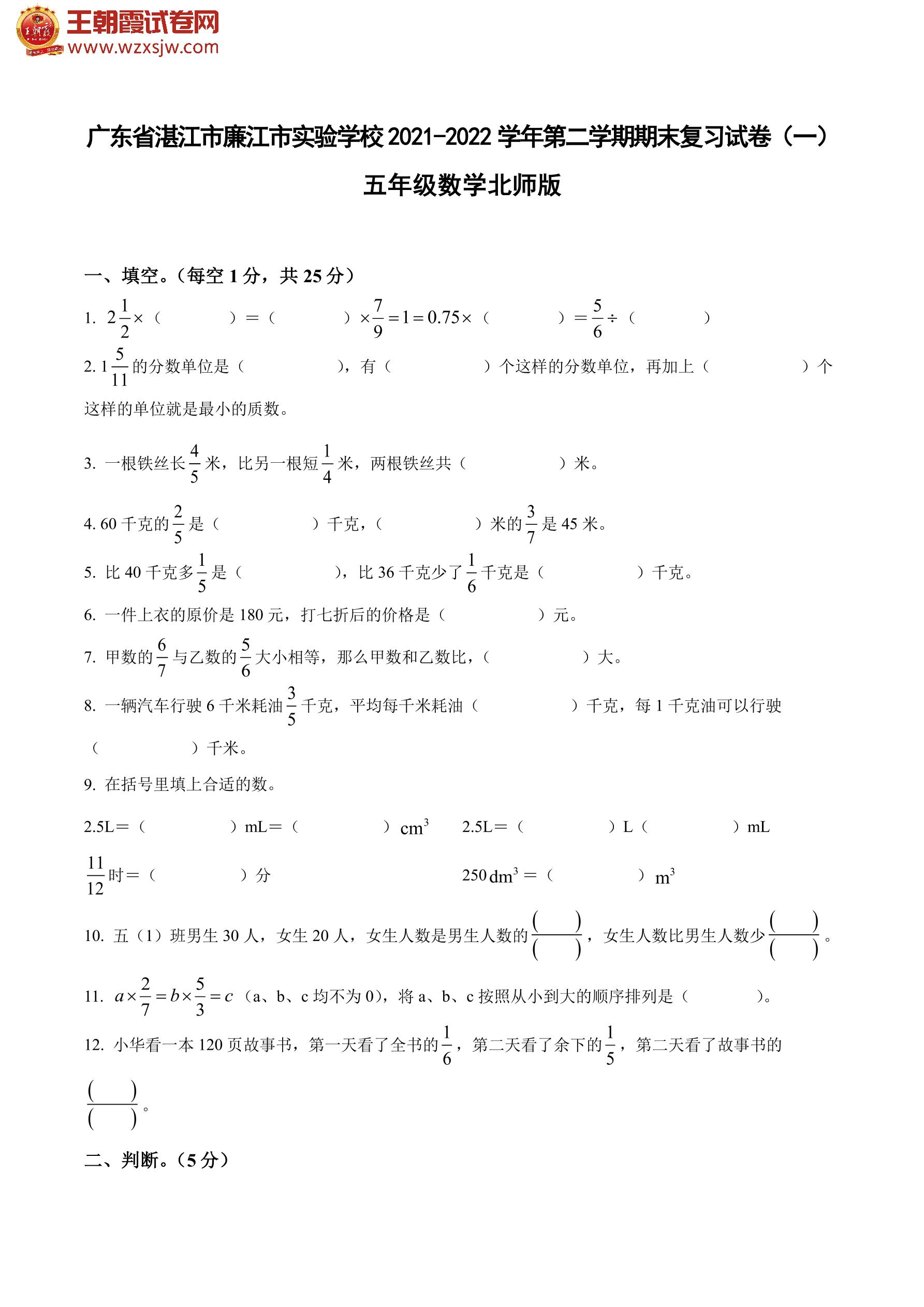 广东省湛江市廉江市实验学校2021-2022学年第二学期期末复习试卷(一)五年级数学(北师版)
