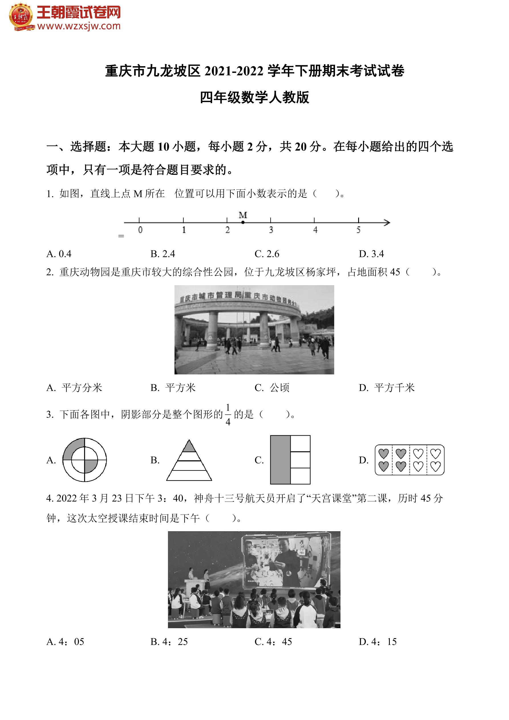 重庆市九龙坡区2021-2022学年下册期末考试试卷四年级数学(人教版)