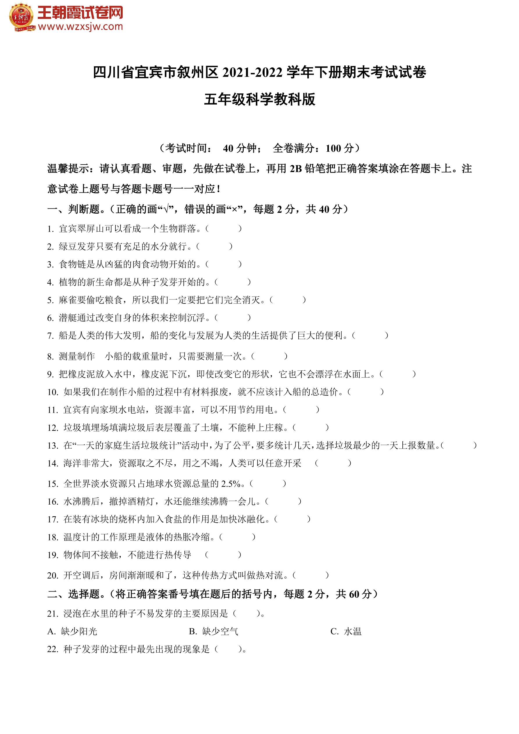 四川省宜宾市叙州区2021-2022学年下册期末考试试卷五年级科学(教科版)