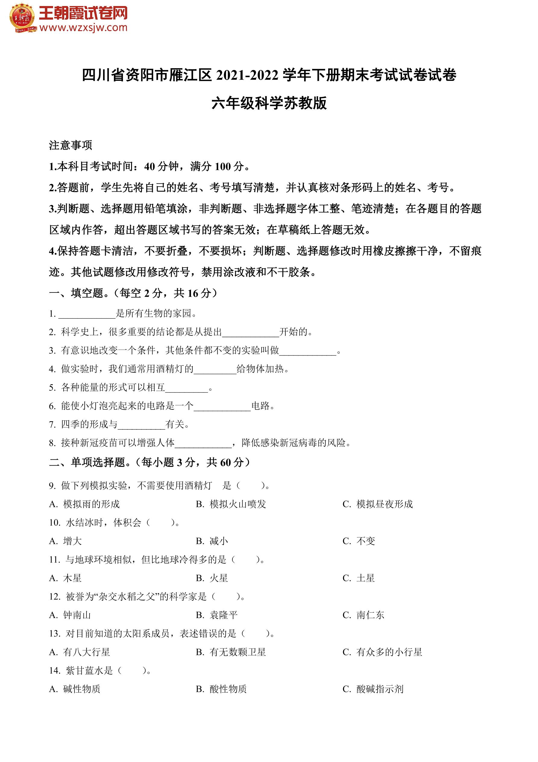 四川省资阳市雁江区2021-2022学年下册期末考试试卷试卷六年级科学(苏教版)