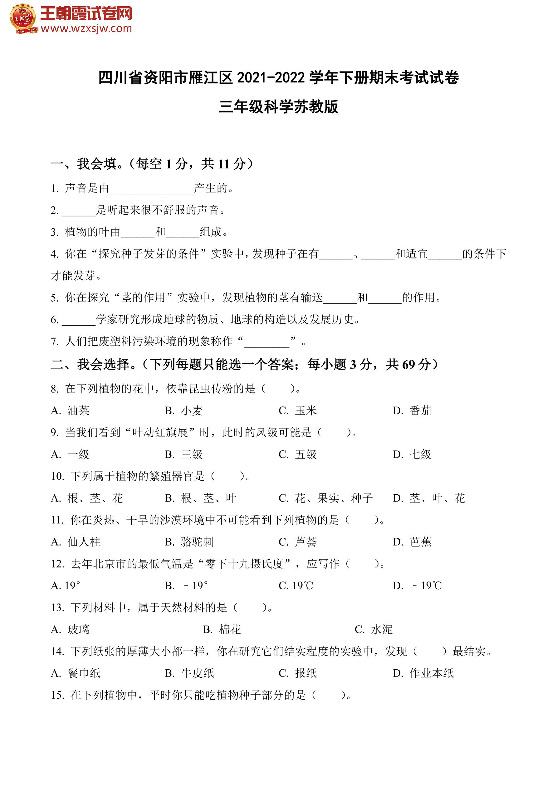 四川省资阳市雁江区2021-2022学年下册期末考试试卷三年级科学(苏教版)