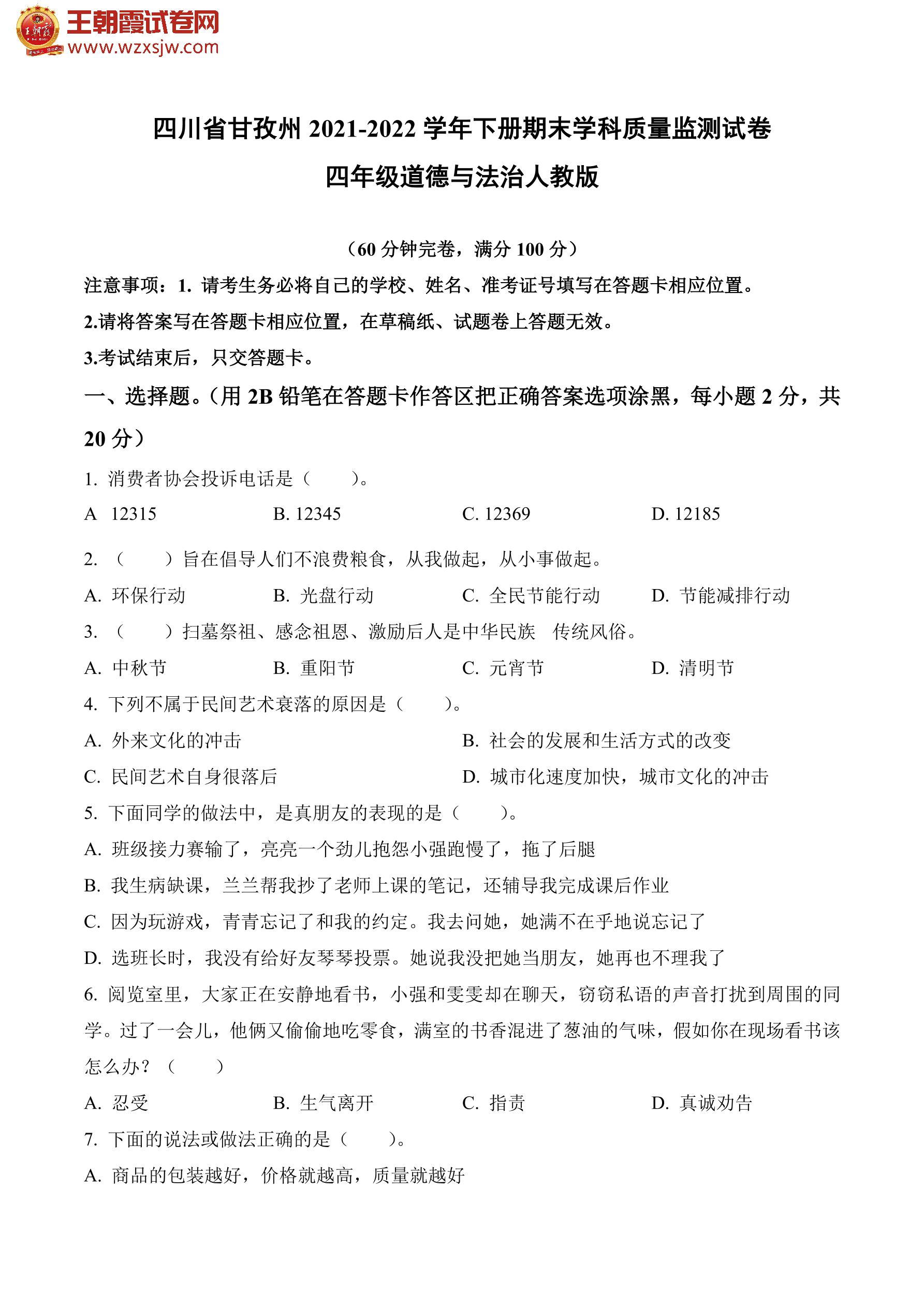 四川省甘孜州2021-2022学年下册期末学科质量监测试卷四年级道德与法治(人教版)
