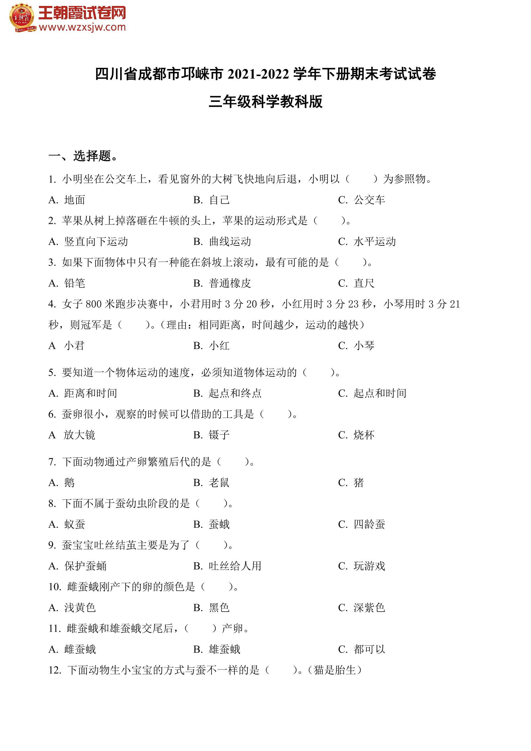四川省成都市邛崃市2021-2022学年下册期末考试试卷三年级科学(教科版)
