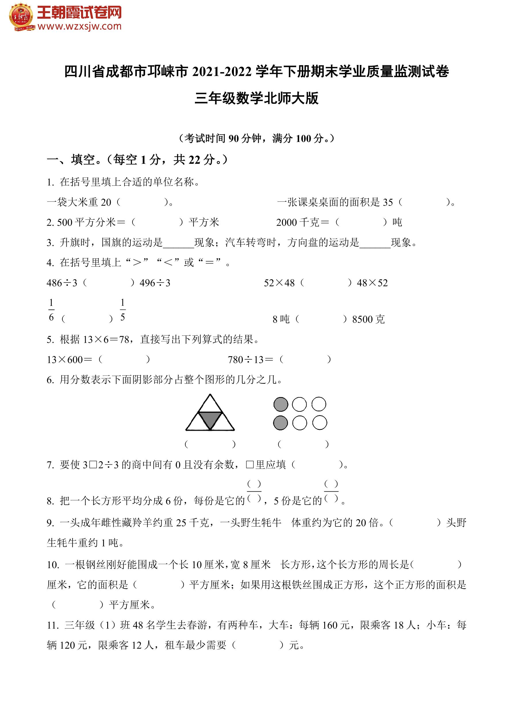 四川省成都市邛崃市2021-2022学年下册期末学业质量监测试卷三年级数学(北师版)