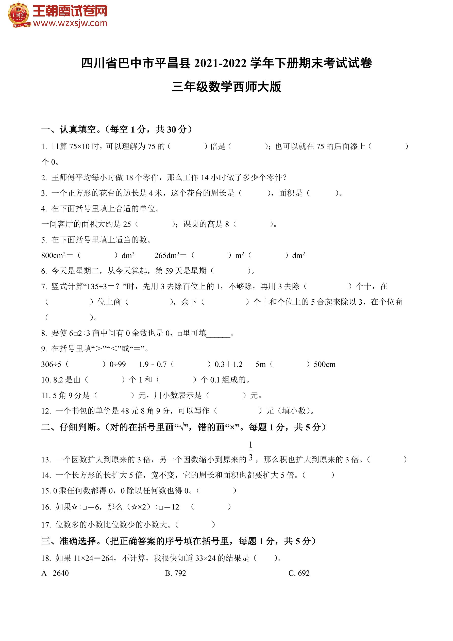 四川省巴中市平昌县2021-2022学年下册期末考试试卷三年级数学(西师版)