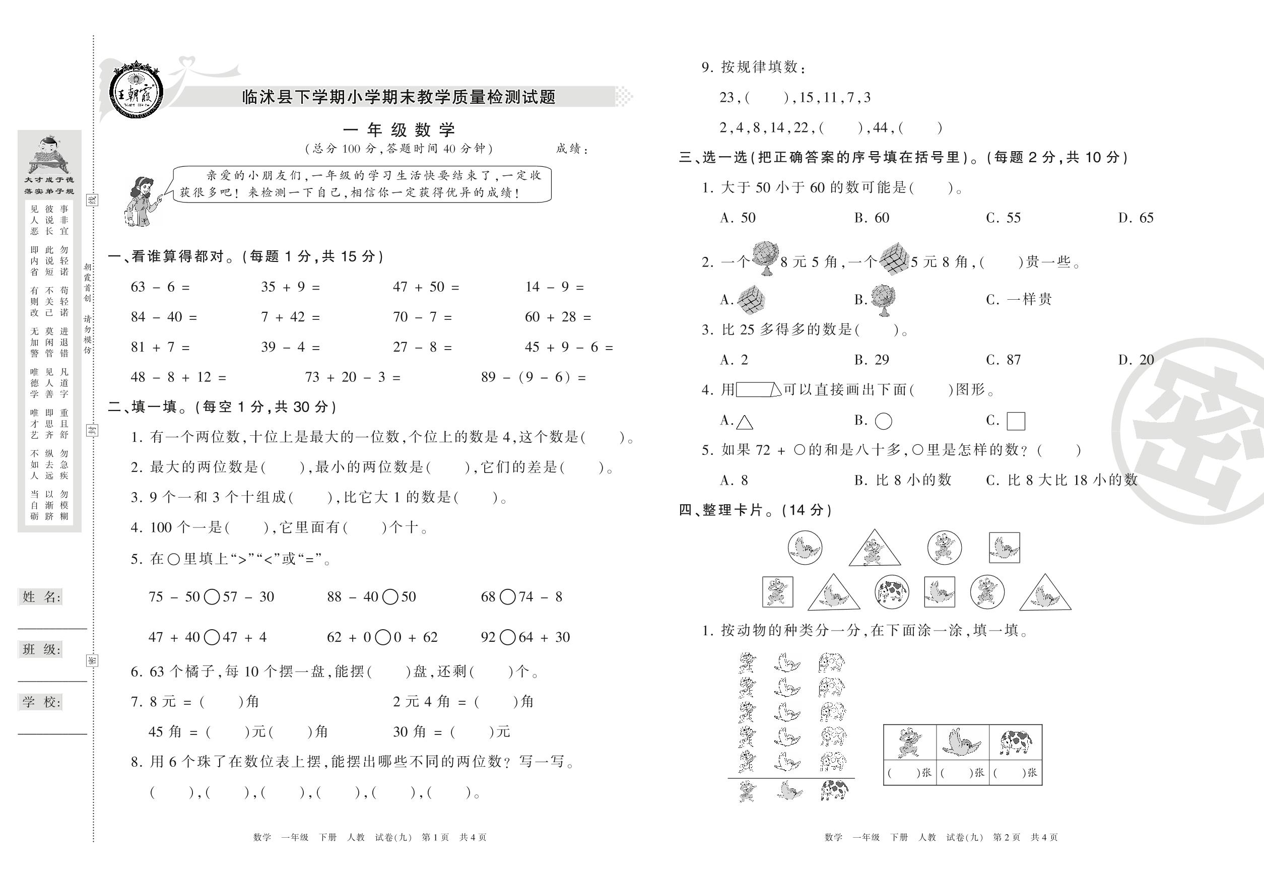 2015-2016学年第二学期临沂市临沭县一年级数学试卷(人教版)【9】