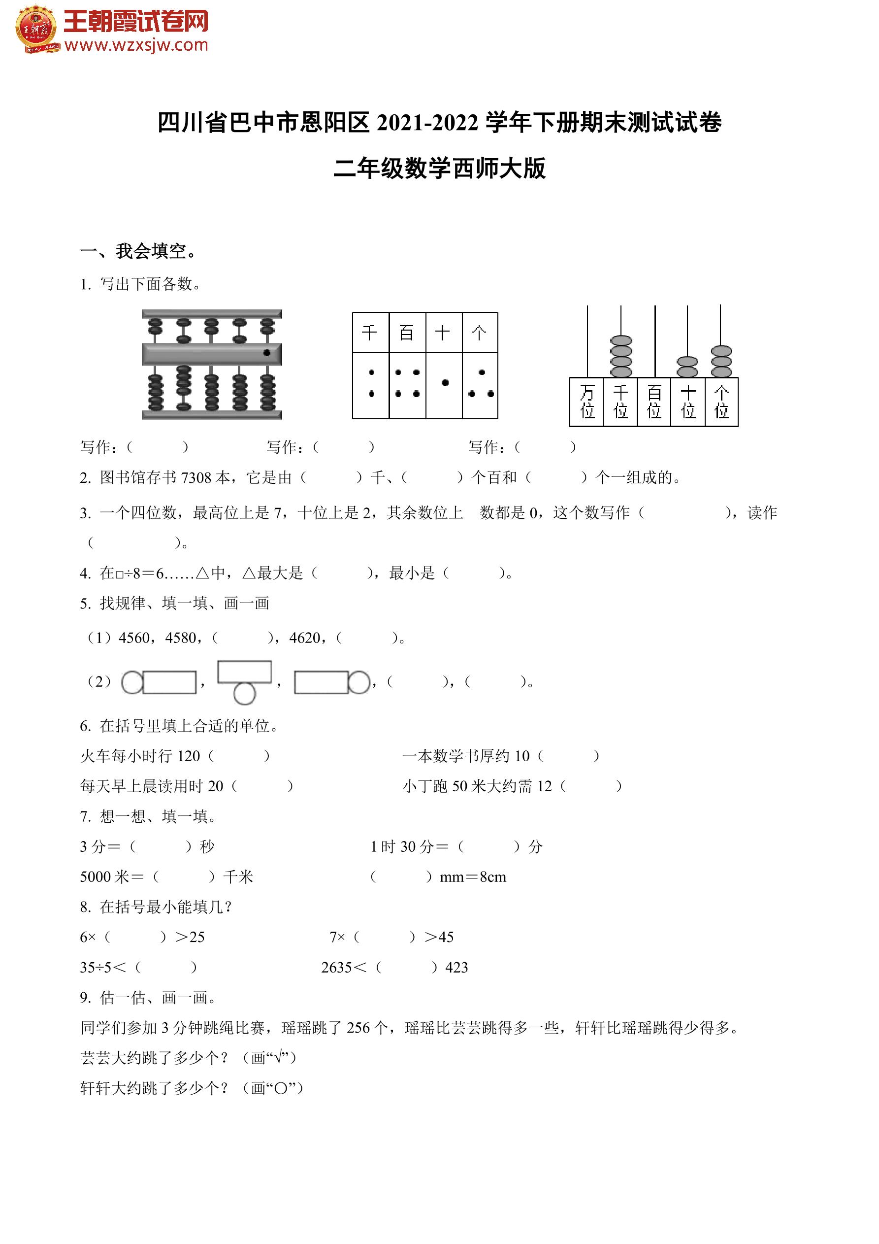 四川省巴中市恩阳区2021-2022学年下册期末测试试卷二年级数学(西师版)
