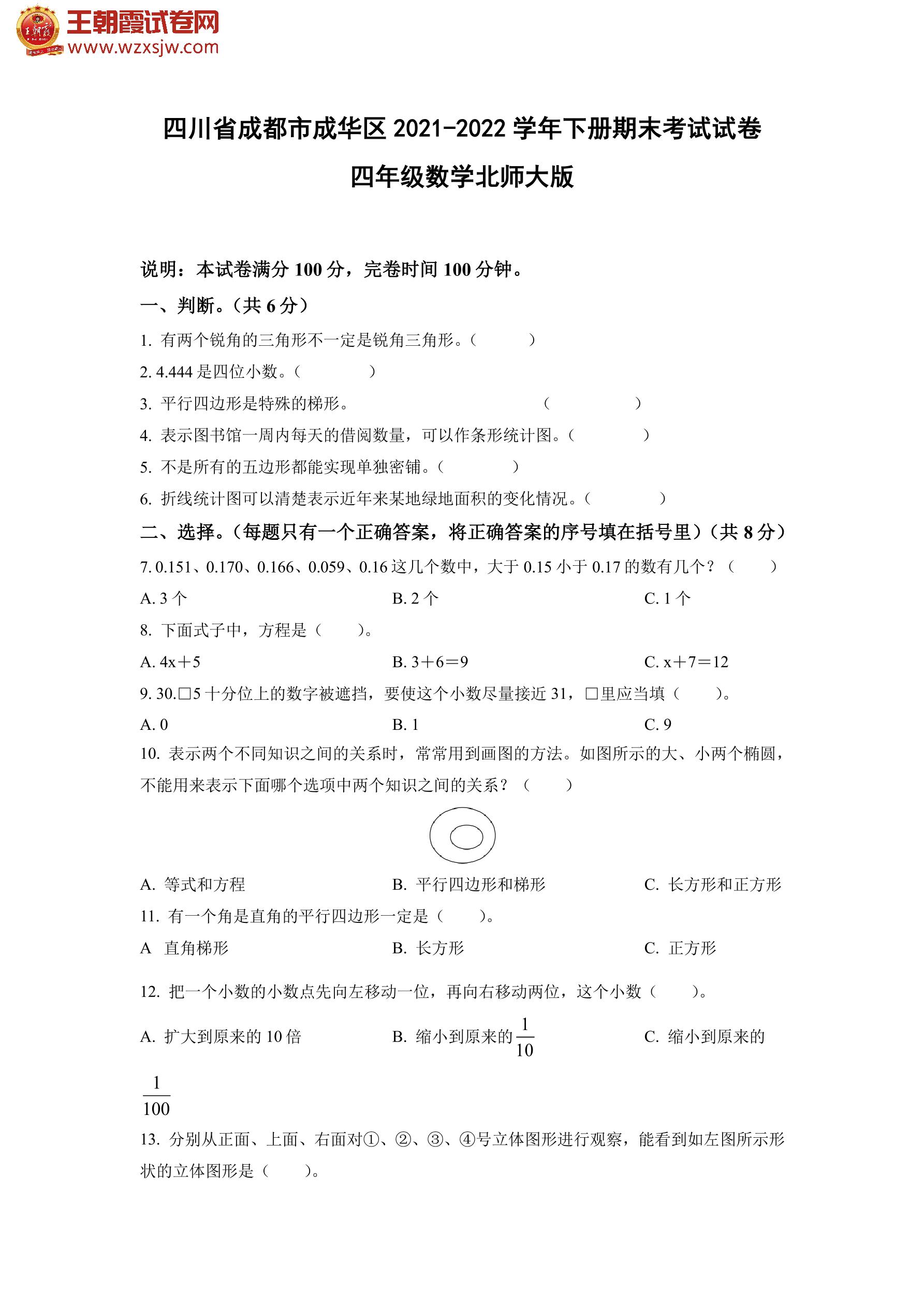 四川省成都市成华区2021-2022学年下册期末考试试卷四年级数学(北师版)