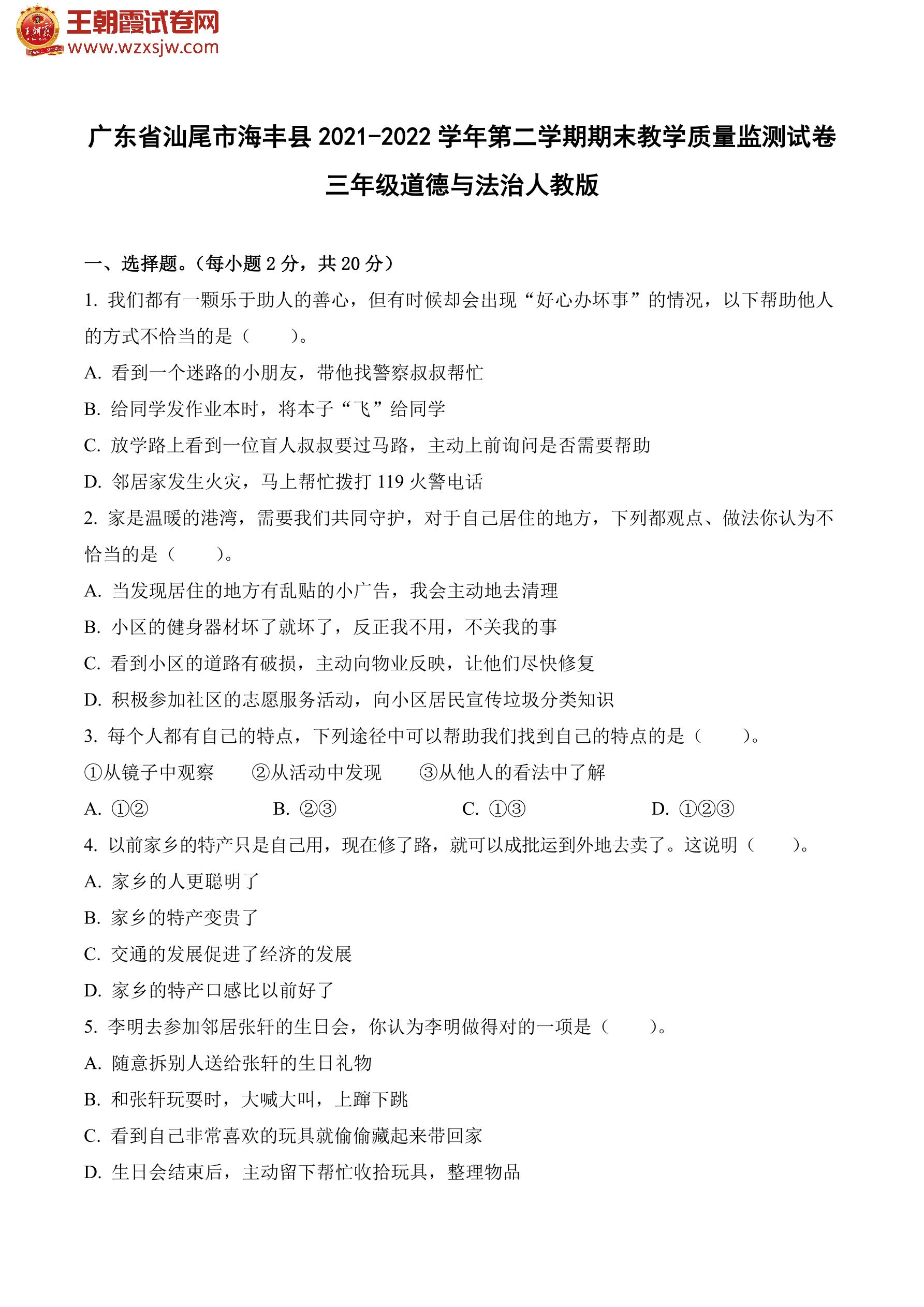 广东省汕尾市海丰县2021-2022学年第二学期期末教学质量监测试卷三年级道德与法治(人教版)