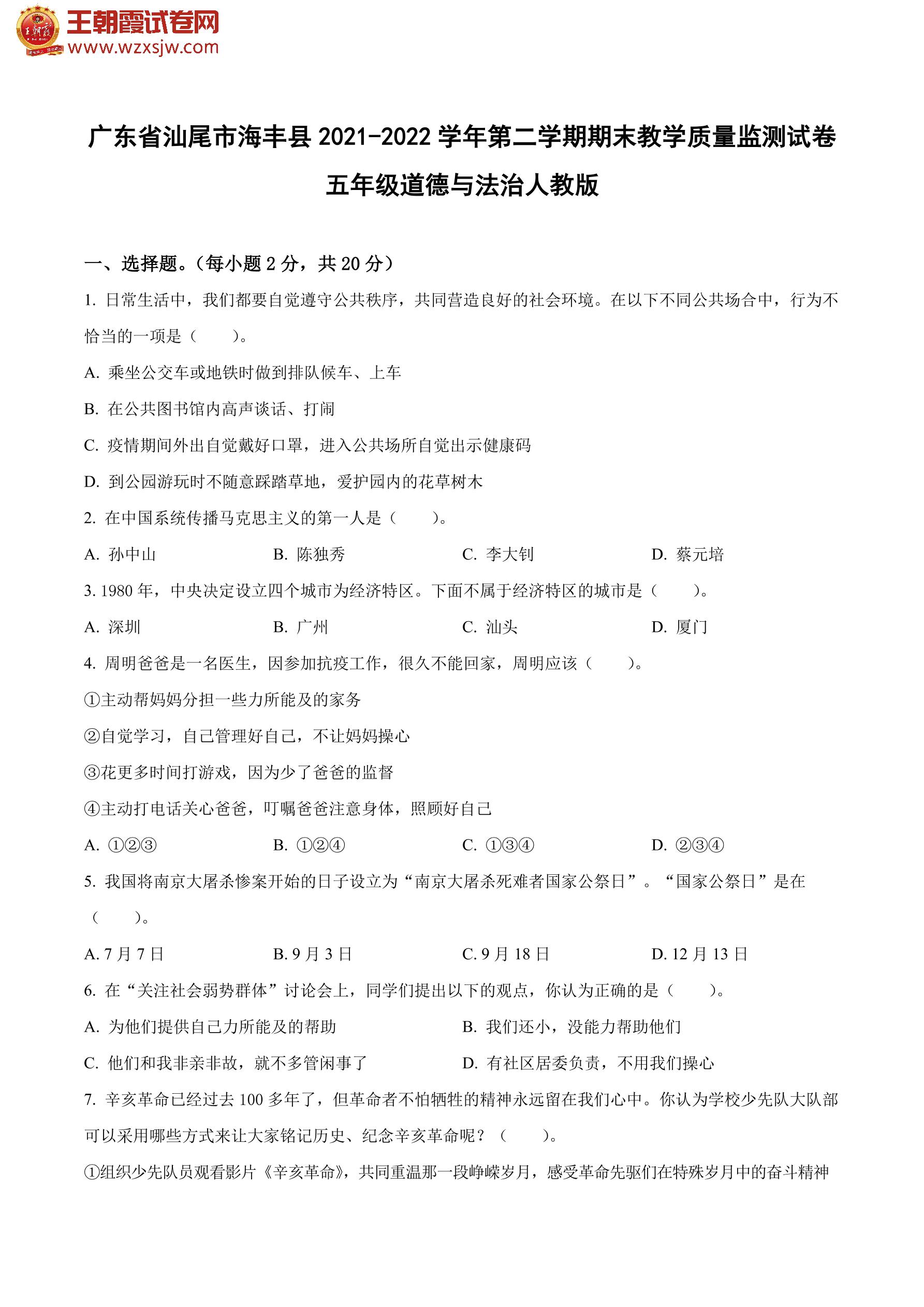 广东省汕尾市海丰县2021-2022学年第二学期期末教学质量监测试卷五年级道德与法治(人教版)