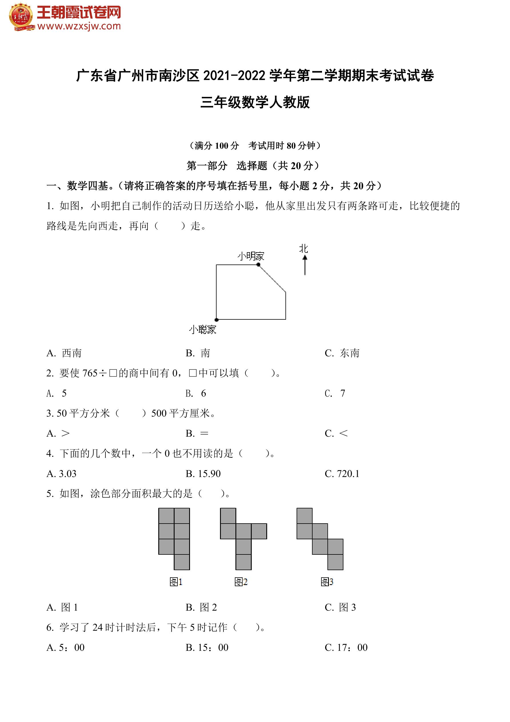 广东省广州市南沙区2021-2022学年第二学期期末考试试卷三年级数学(人教版)