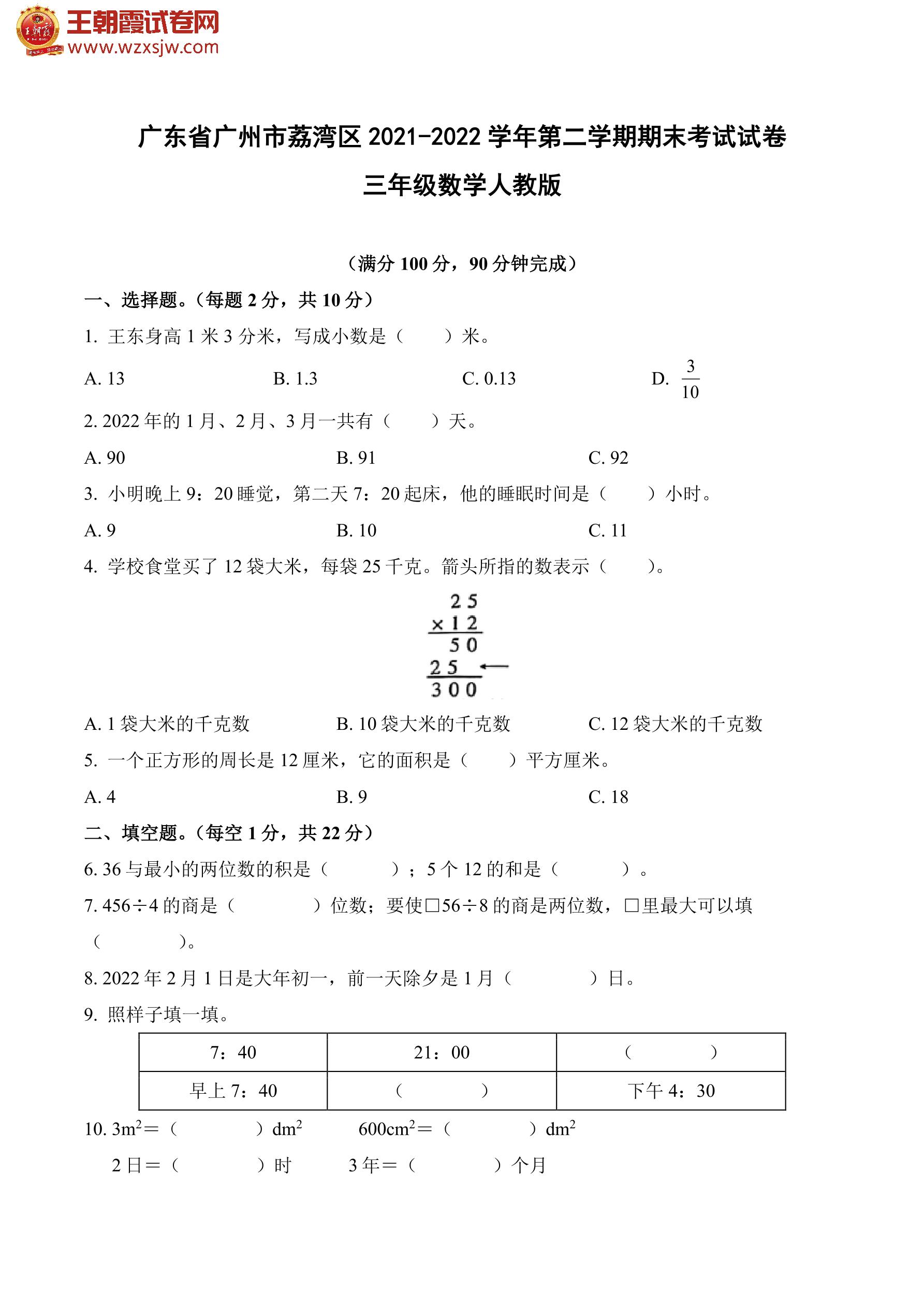 广东省广州市荔湾区2021-2022学年第二学期期末考试试卷三年级数学(人教版)