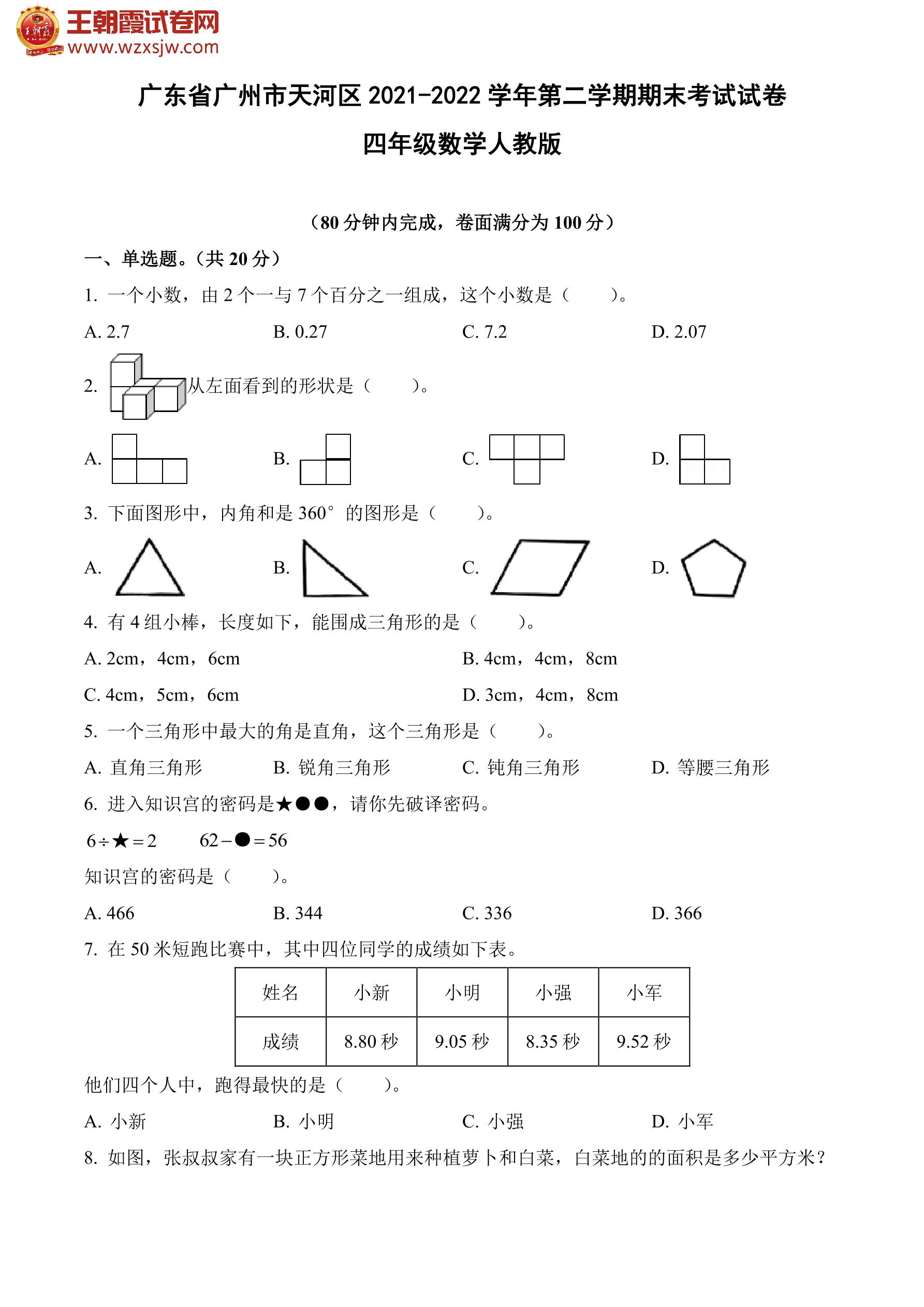 广东省广州市天河区2021-2022学年第二学期期末考试试卷四年级数学(人教版)
