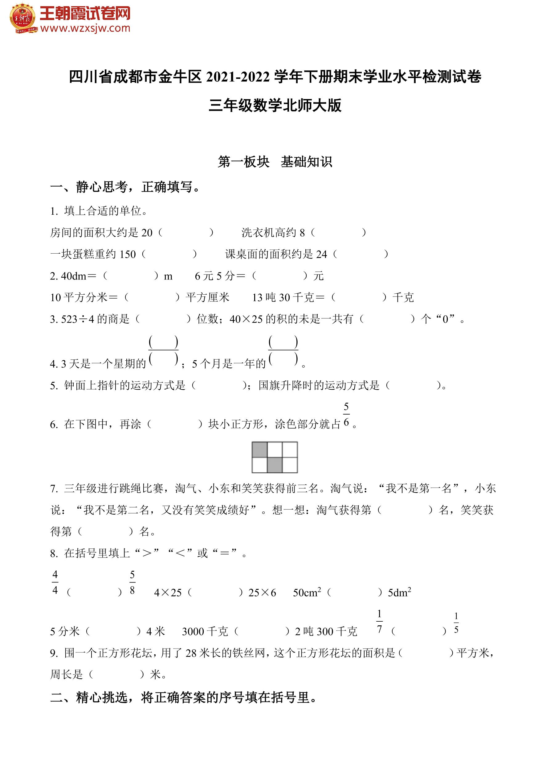 四川省成都市金牛区2021-2022学年下册期末学业水平检测试卷三年级数学(北师版)