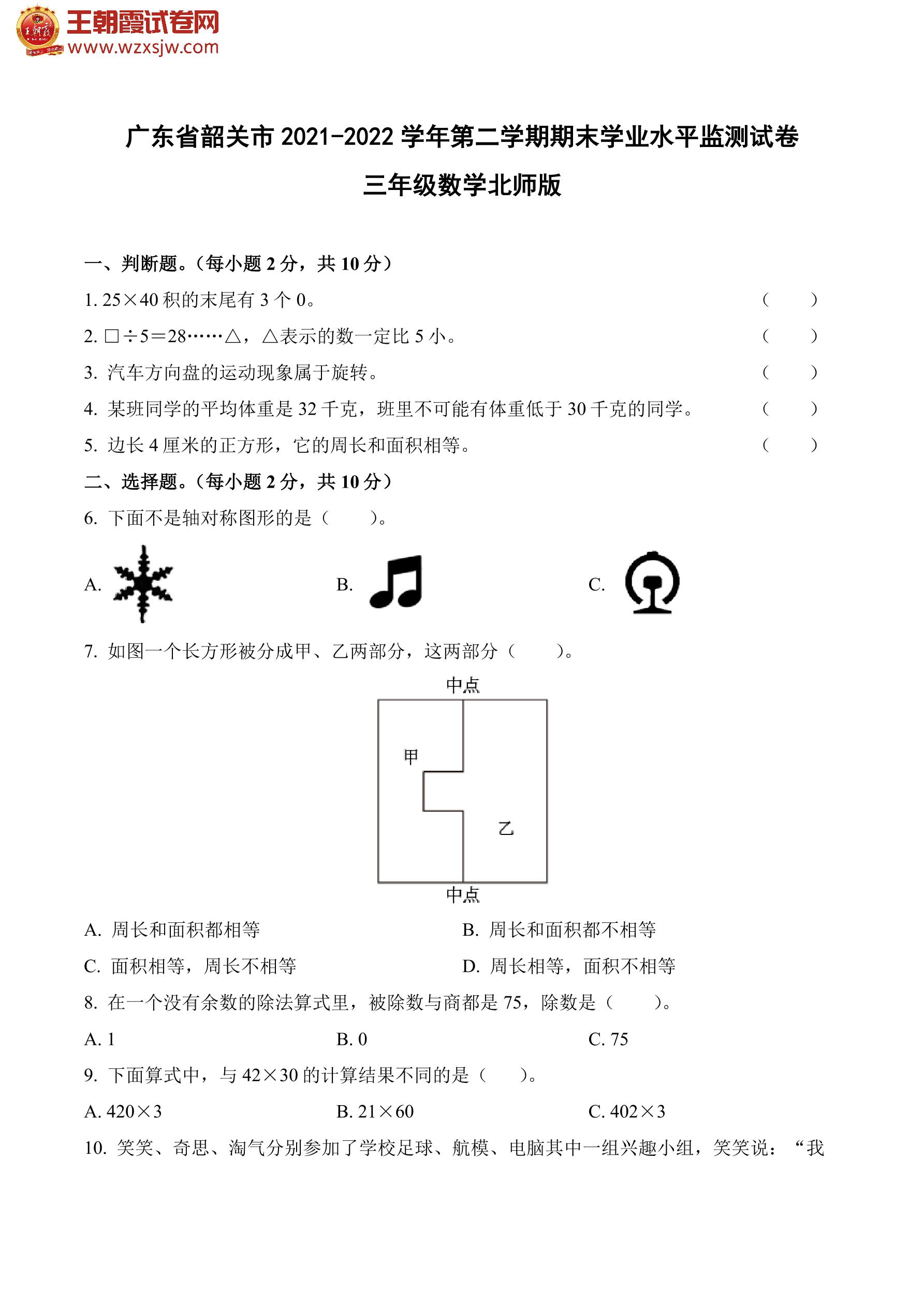 广东省韶关市2021-2022学年第二学期期末学业水平监测试卷三年级数学(北师版)