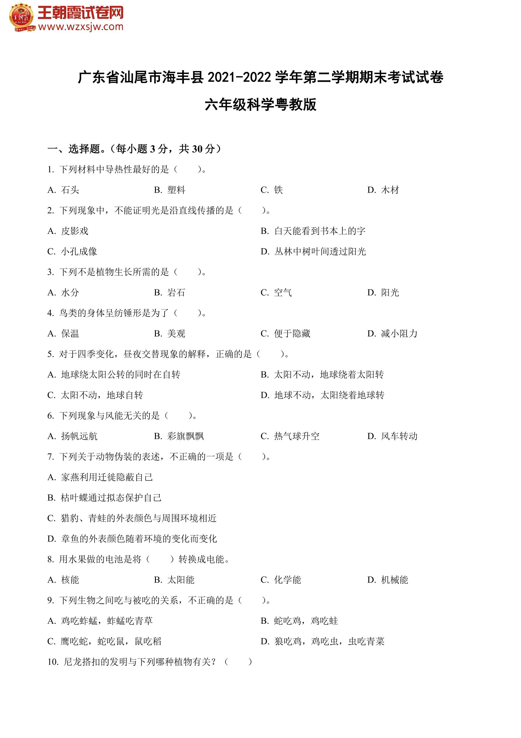 广东省汕尾市海丰县2021-2022学年第二学期期末考试试卷六年级科学(粤教粤科版)
