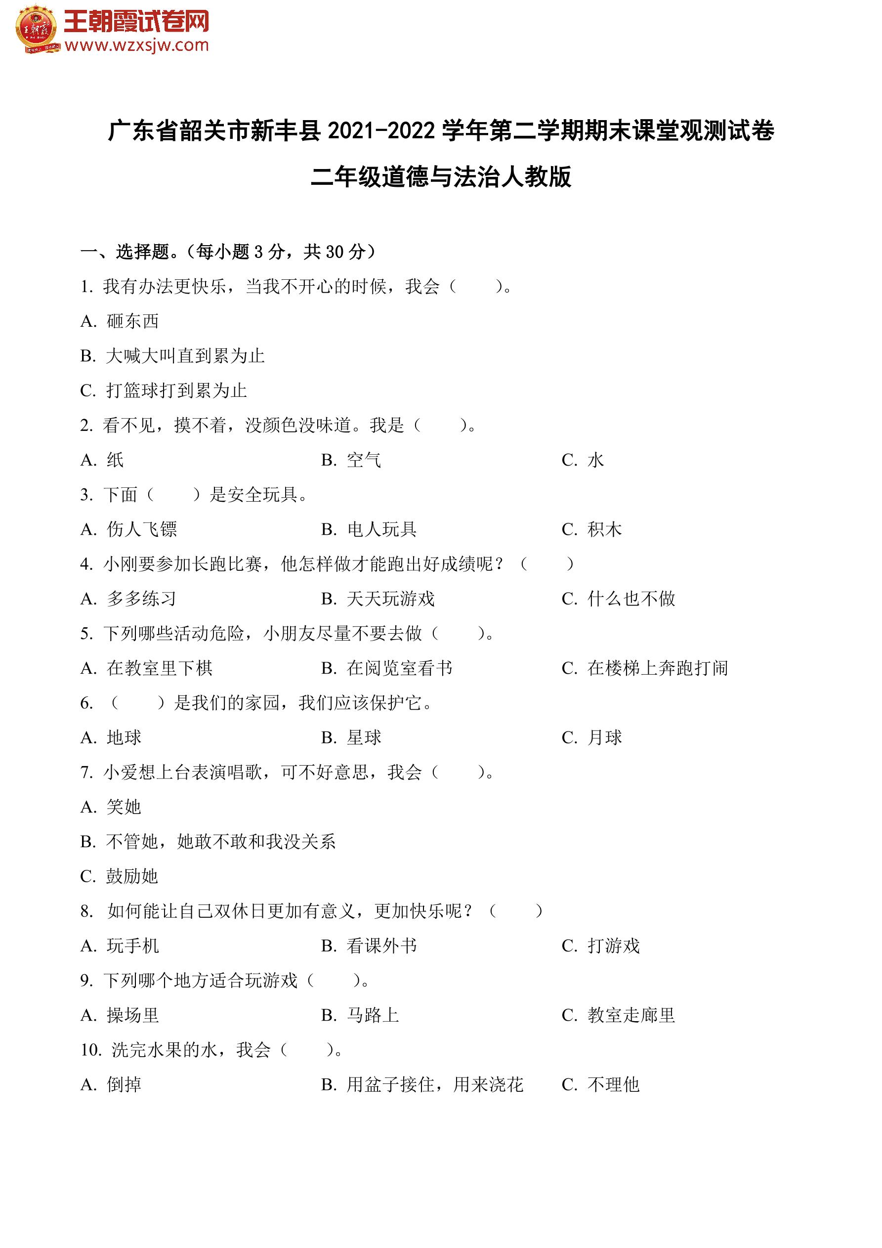 广东省韶关市新丰县2021-2022学年第二学期期末课堂观测试卷二年级道德与法治(人教版)