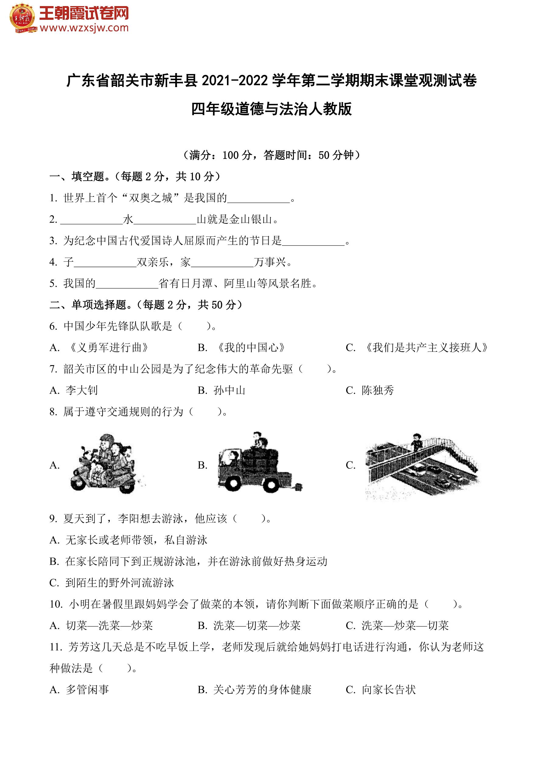 广东省韶关市新丰县2021-2022学年第二学期期末课堂观测试卷四年级道德与法治(人教版)