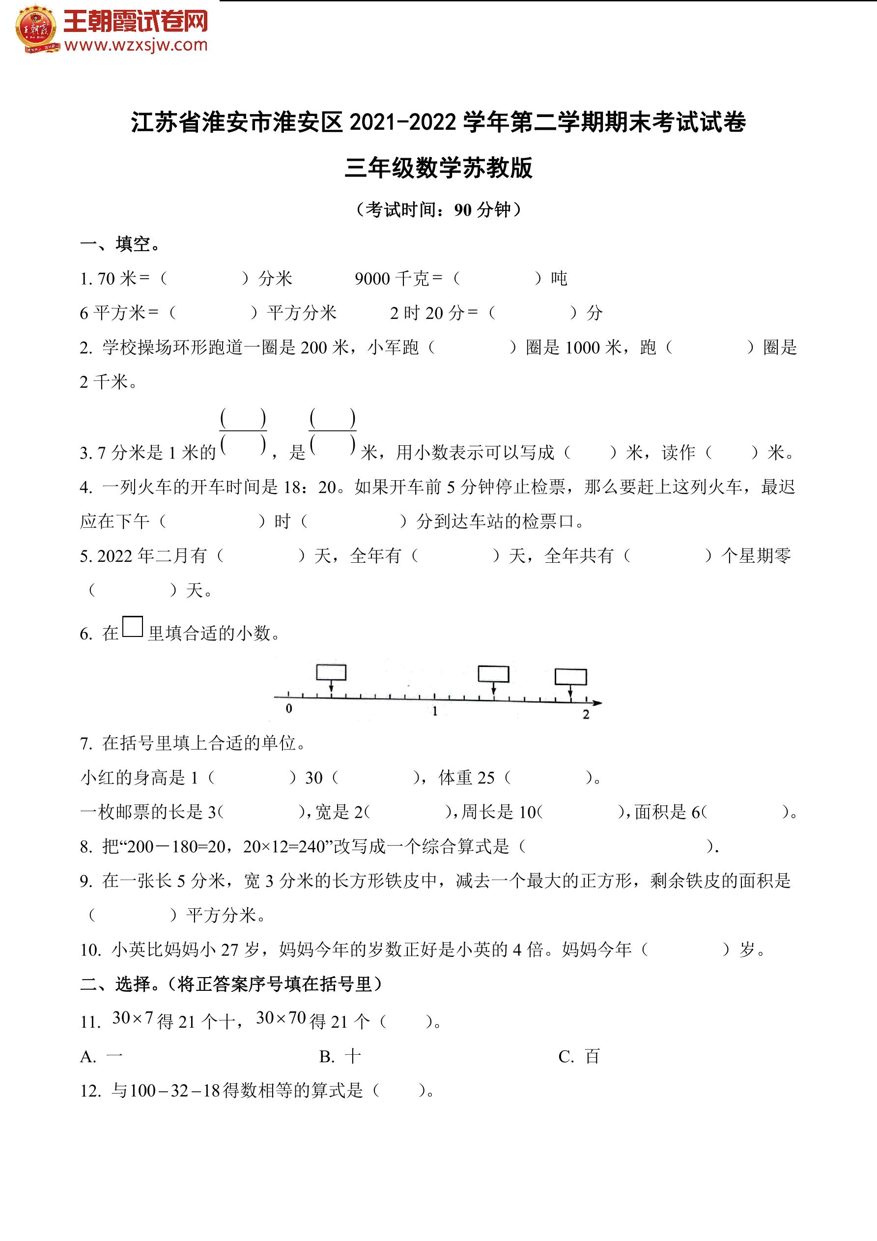 江苏省淮安市淮安区2021-2022学年第二学期期末考试试卷三年级数学(苏教版)
