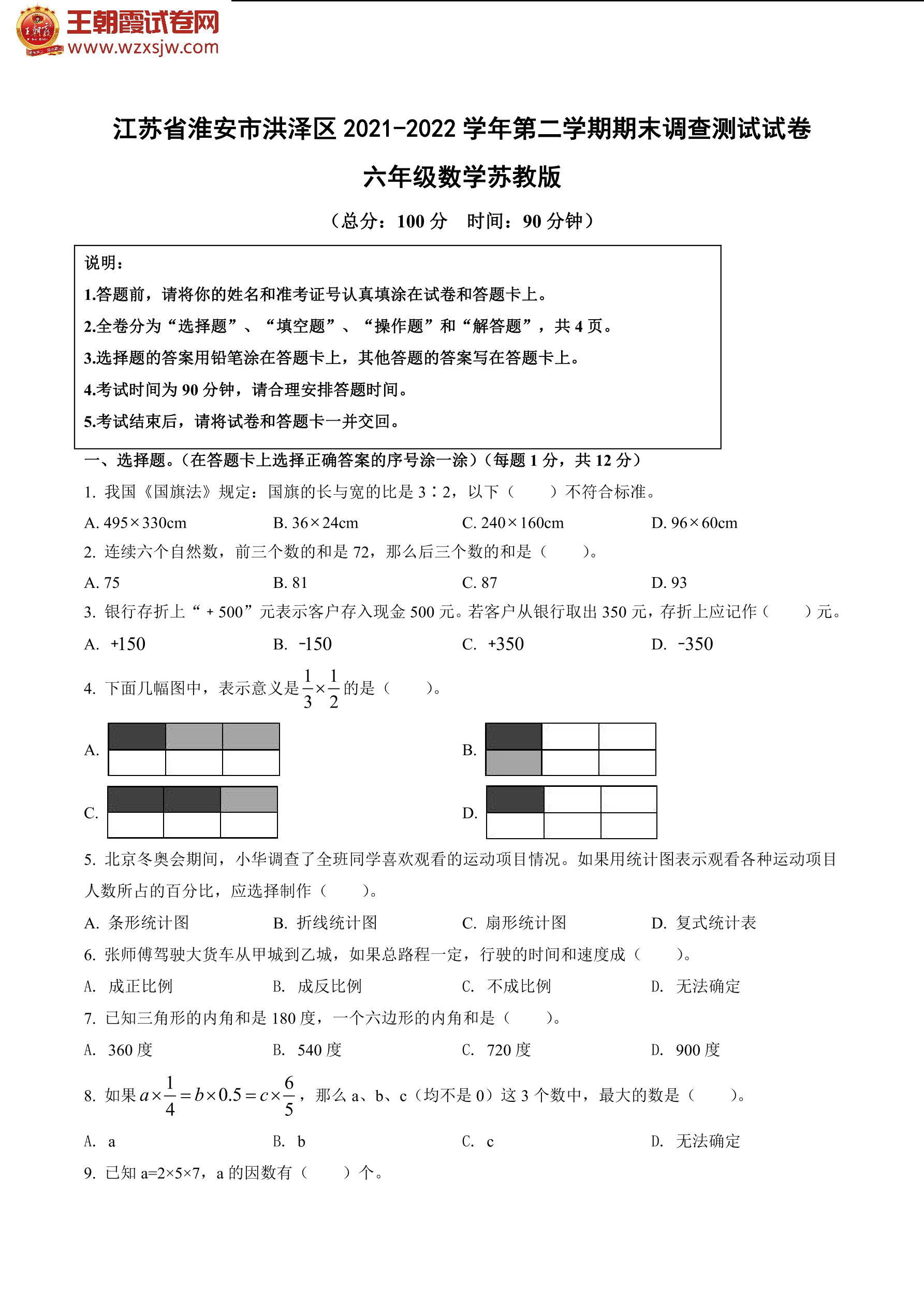 江苏省淮安市洪泽区2021-2022学年第二学期期末调查测试试卷六年级数学(苏教版)