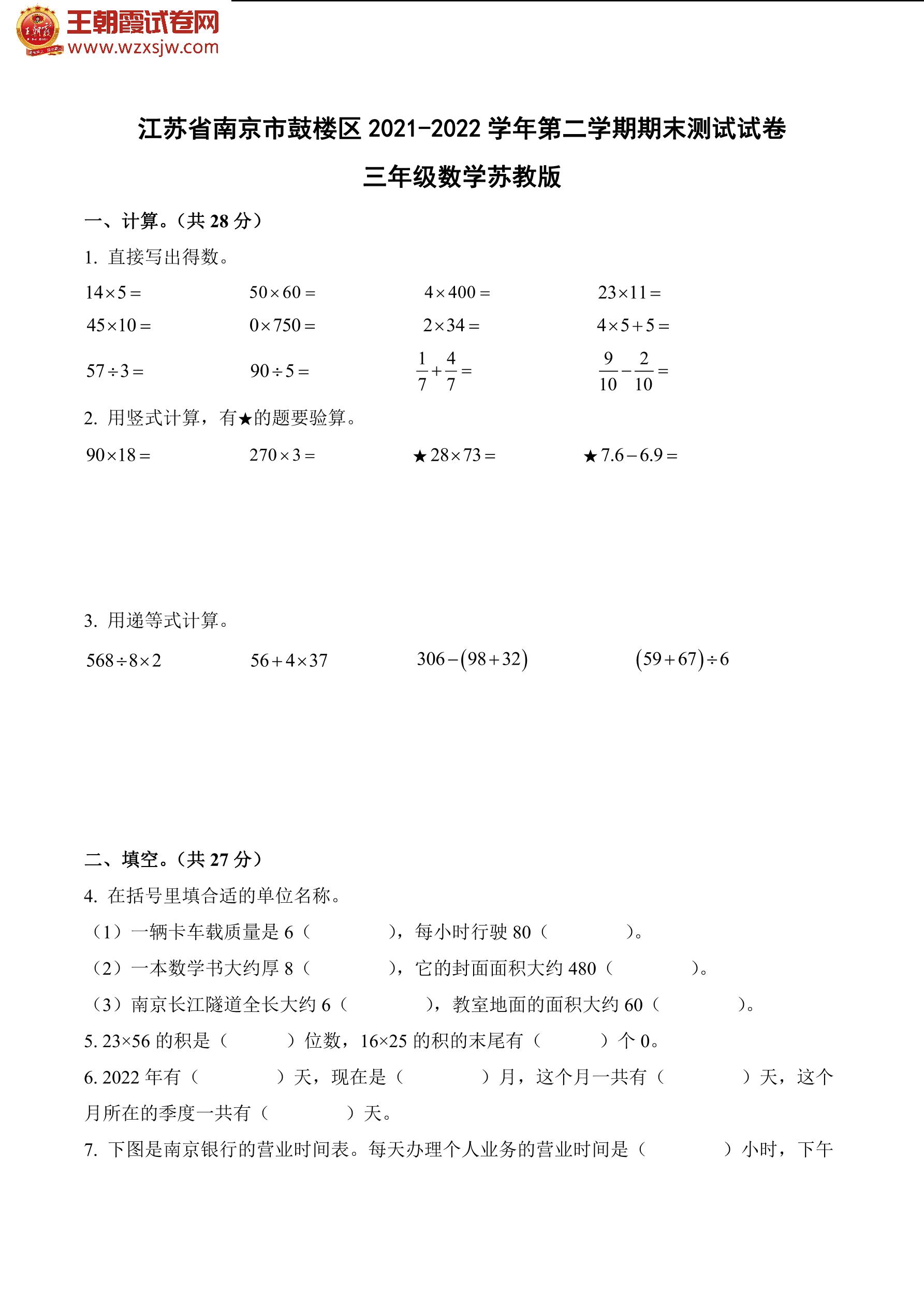 江苏省南京市鼓楼区2021-2022学年第二学期期末测试试卷三年级数学(苏教版)