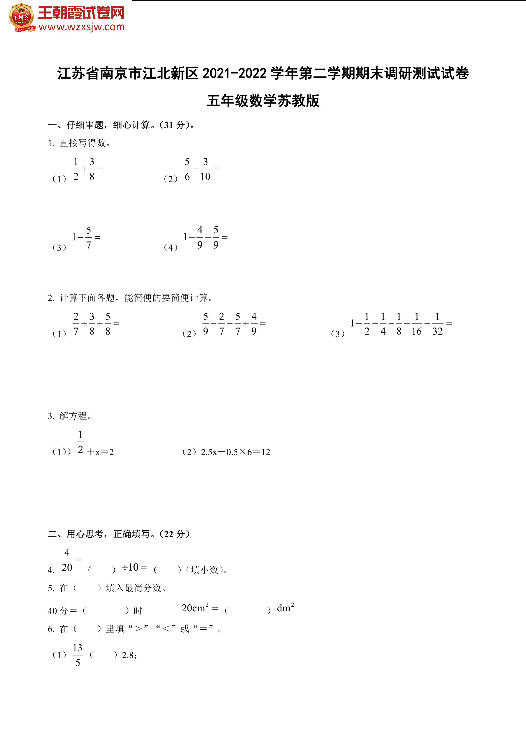 江苏省南京市江北新区2021-2022学年第二学期期末调研测试试卷五年级数学(苏教版)