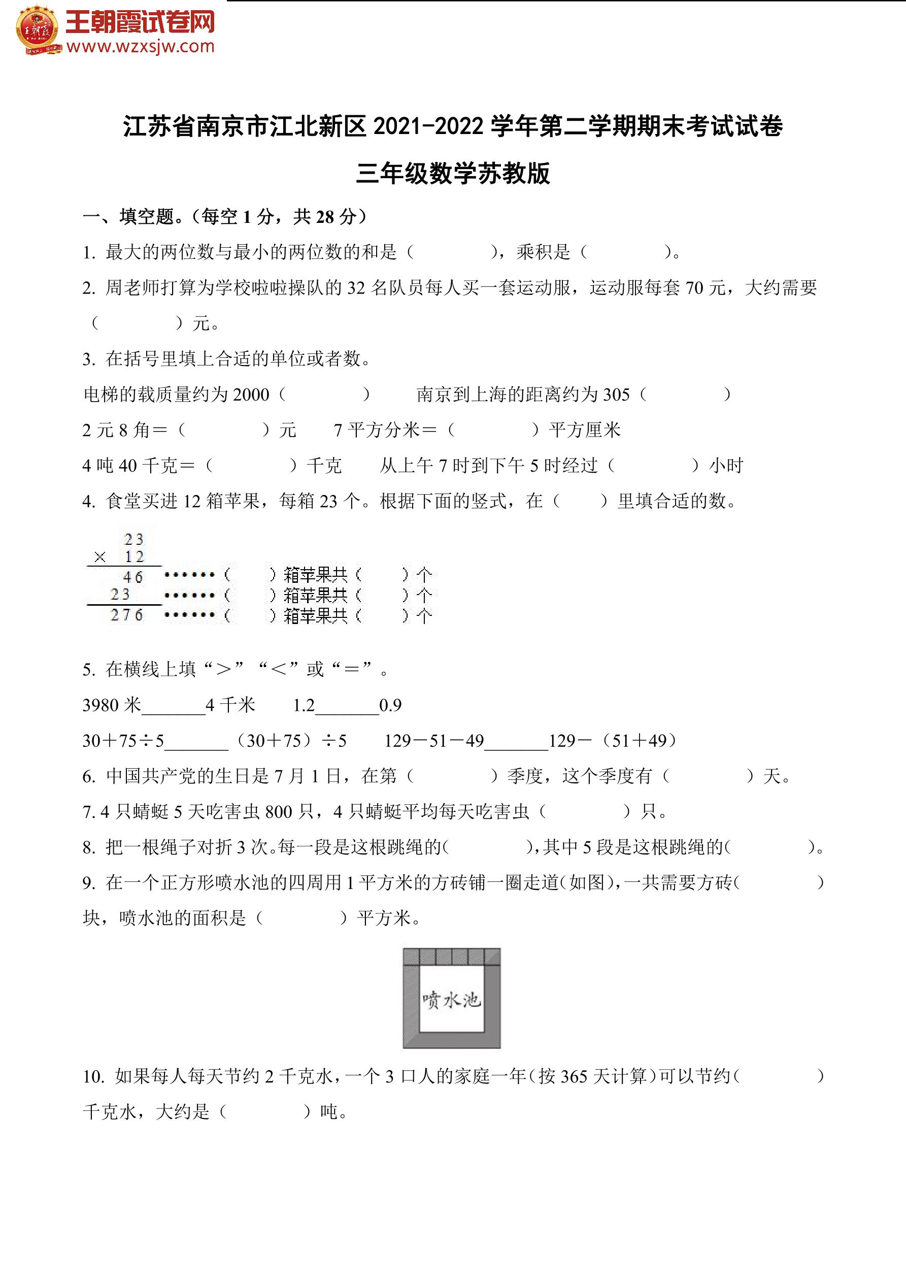 江苏省南京市江北新区2021-2022学年第二学期期末考试试卷三年级数学(苏教版)