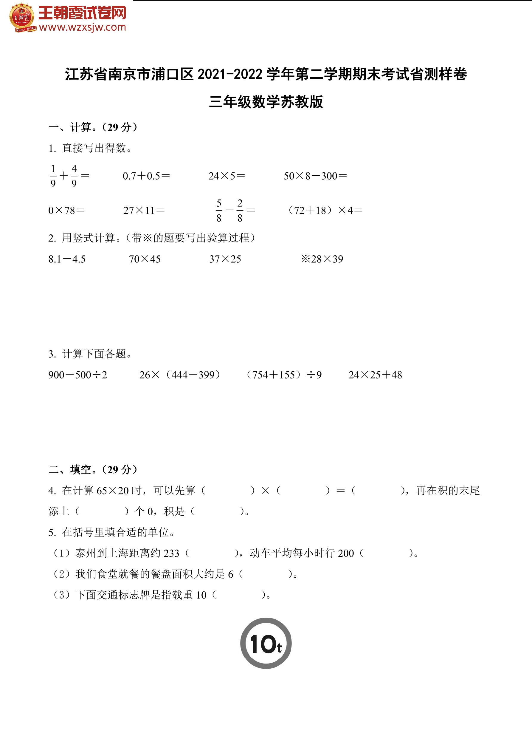 江苏省南京市浦口区2021-2022学年第二学期期末考试省测样卷三年级数学(苏教版)