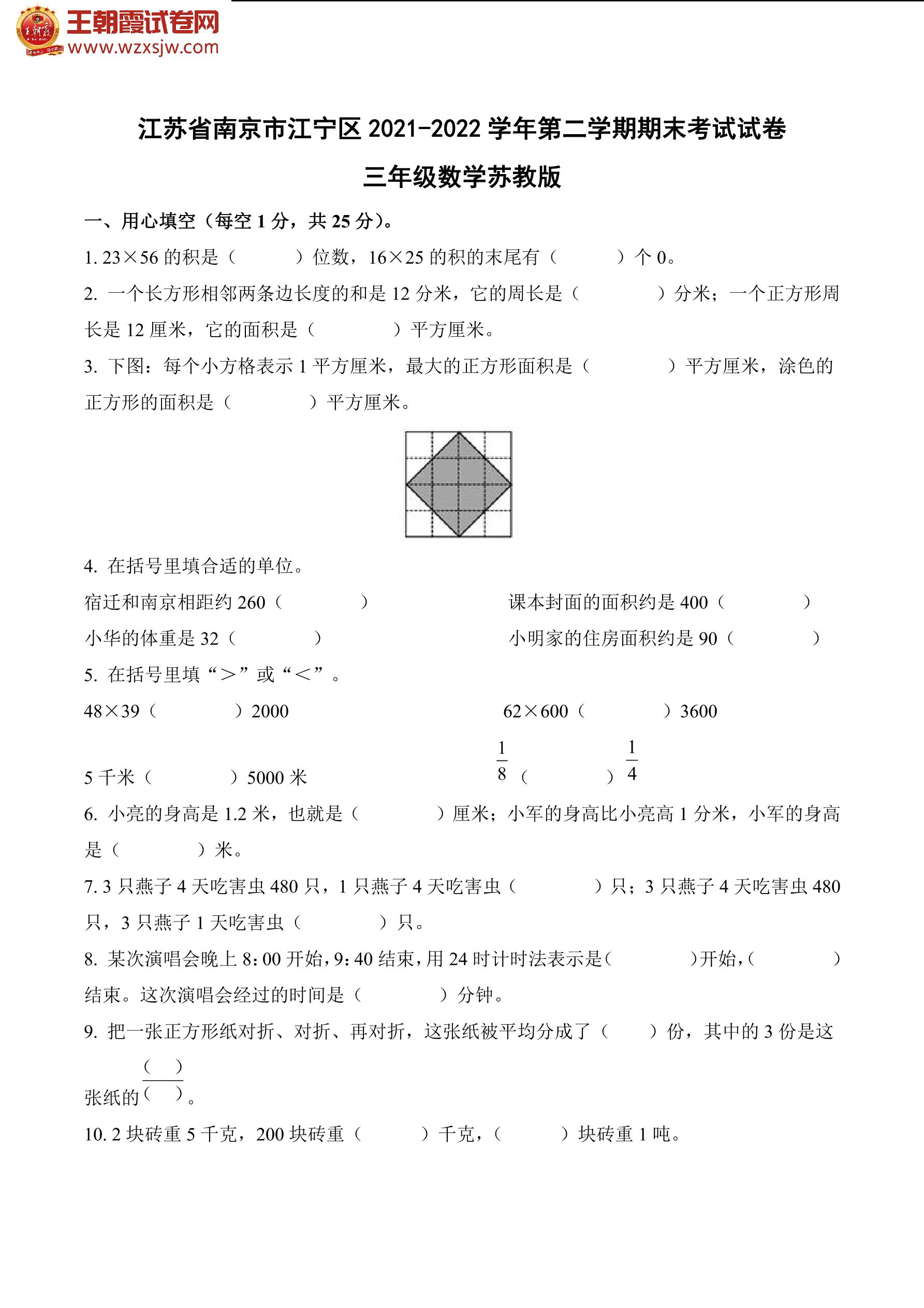 江苏省南京市江宁区2021-2022学年第二学期期末考试试卷三年级数学(苏教版)