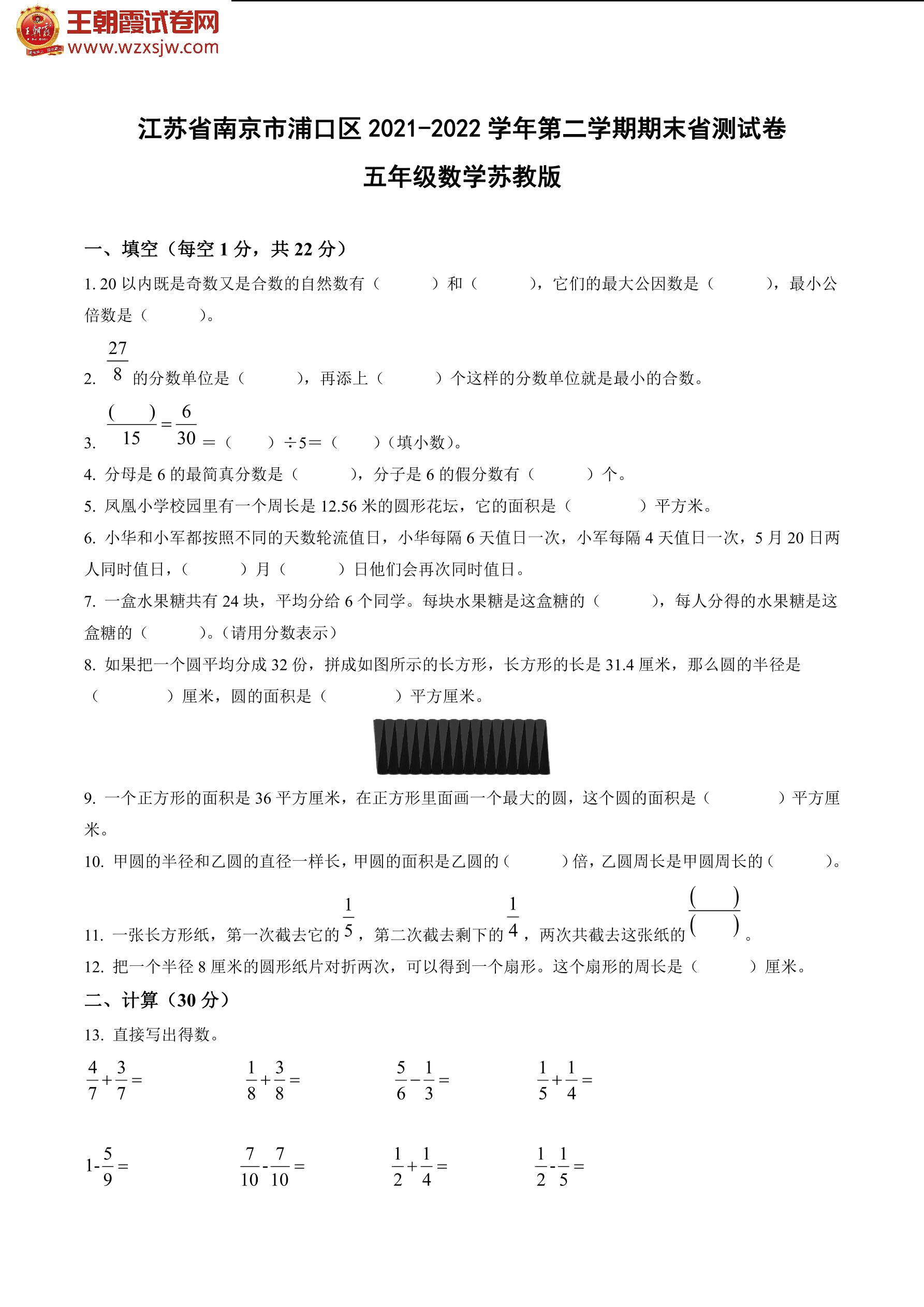 江苏省南京市浦口区2021-2022学年第二学期期末省测试卷五年级数学(苏教版)
