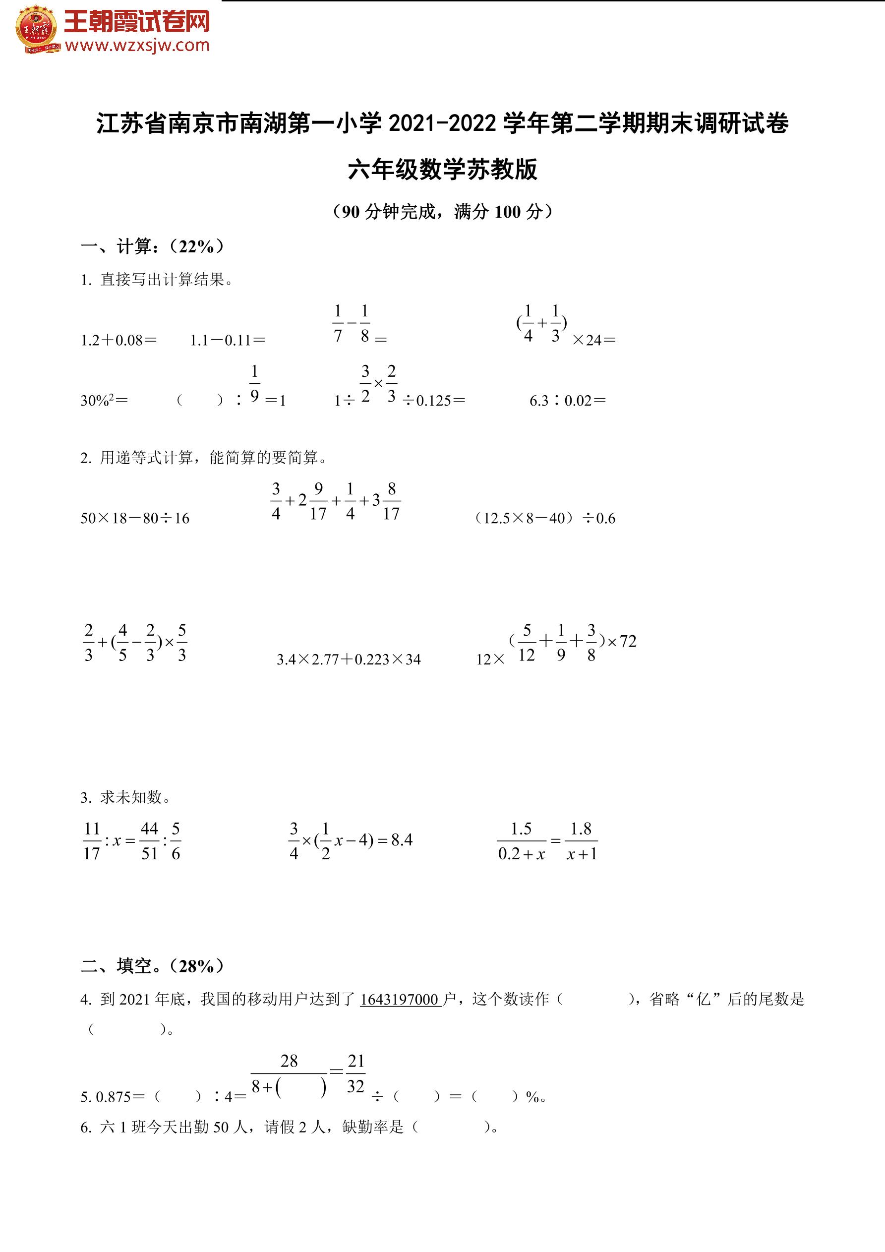 江苏省南京市南湖第一小学2021-2022学年第二学期期末调研试卷六年级数学(苏教版)