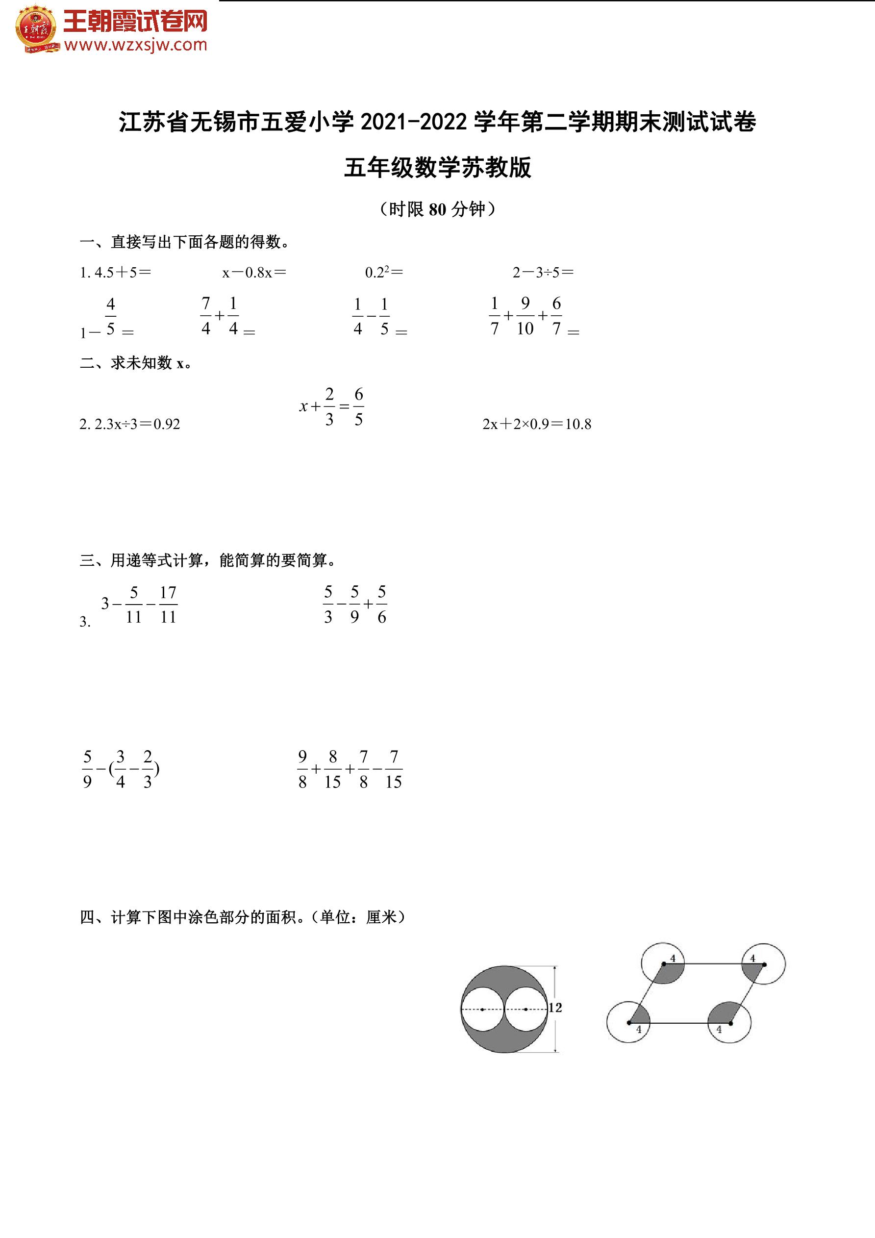 江苏省无锡市五爱小学2021-2022学年第二学期期末测试试卷五年级数学(苏教版)