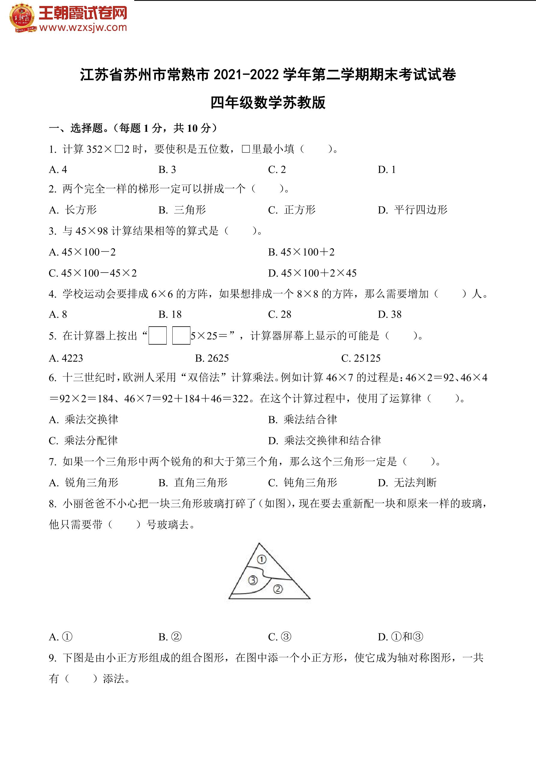 江苏省苏州市常熟市2021-2022学年第二学期期末考试试卷四年级数学(苏教版)