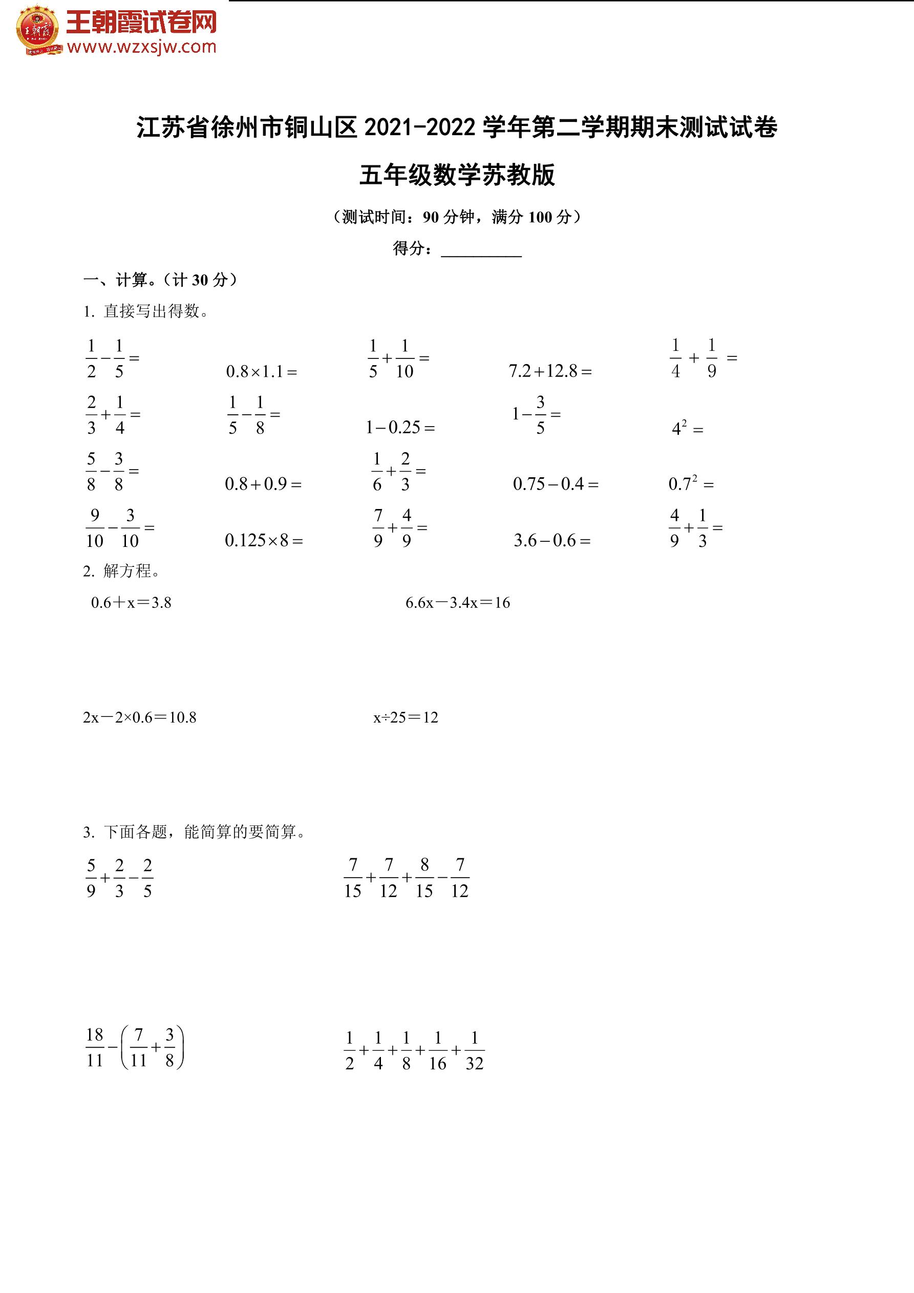 江苏省徐州市铜山区2021-2022学年第二学期期末测试试卷五年级数学(苏教版)