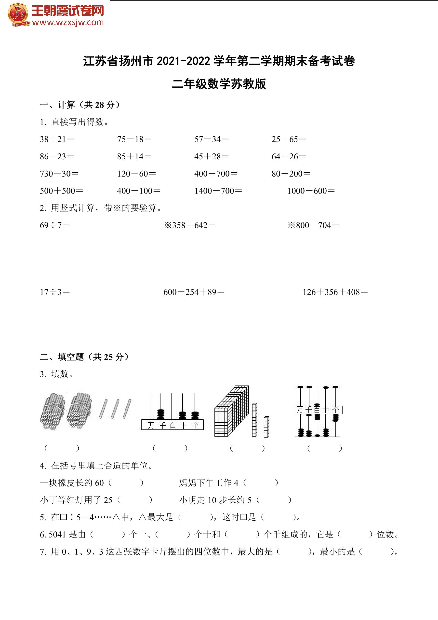 江苏省扬州市2021-2022学年第二学期期末备考试卷二年级数学(苏教版)