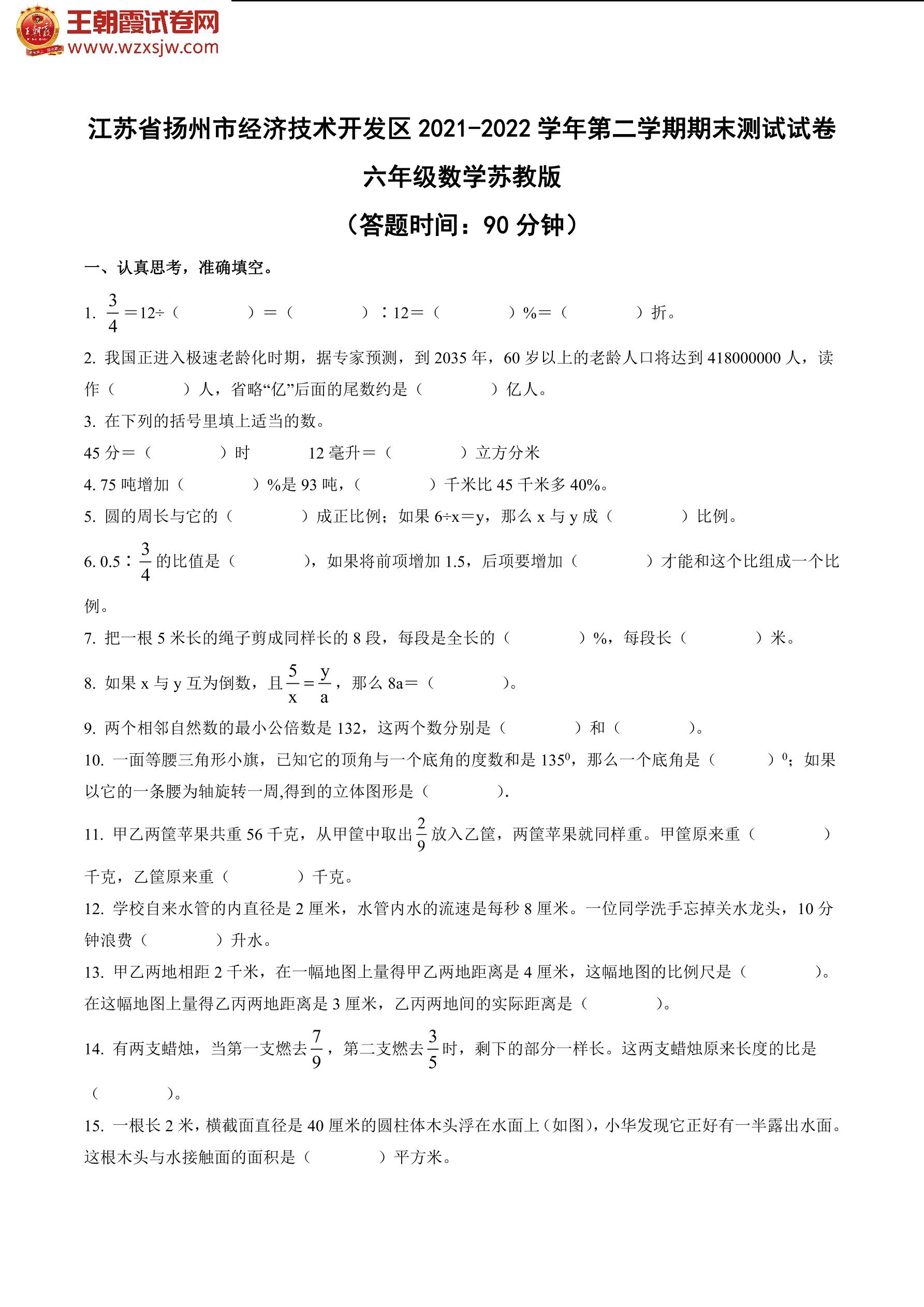 江苏省扬州市经济技术开发区2021-2022学年第二学期期末测试试卷六年级数学(苏教版)