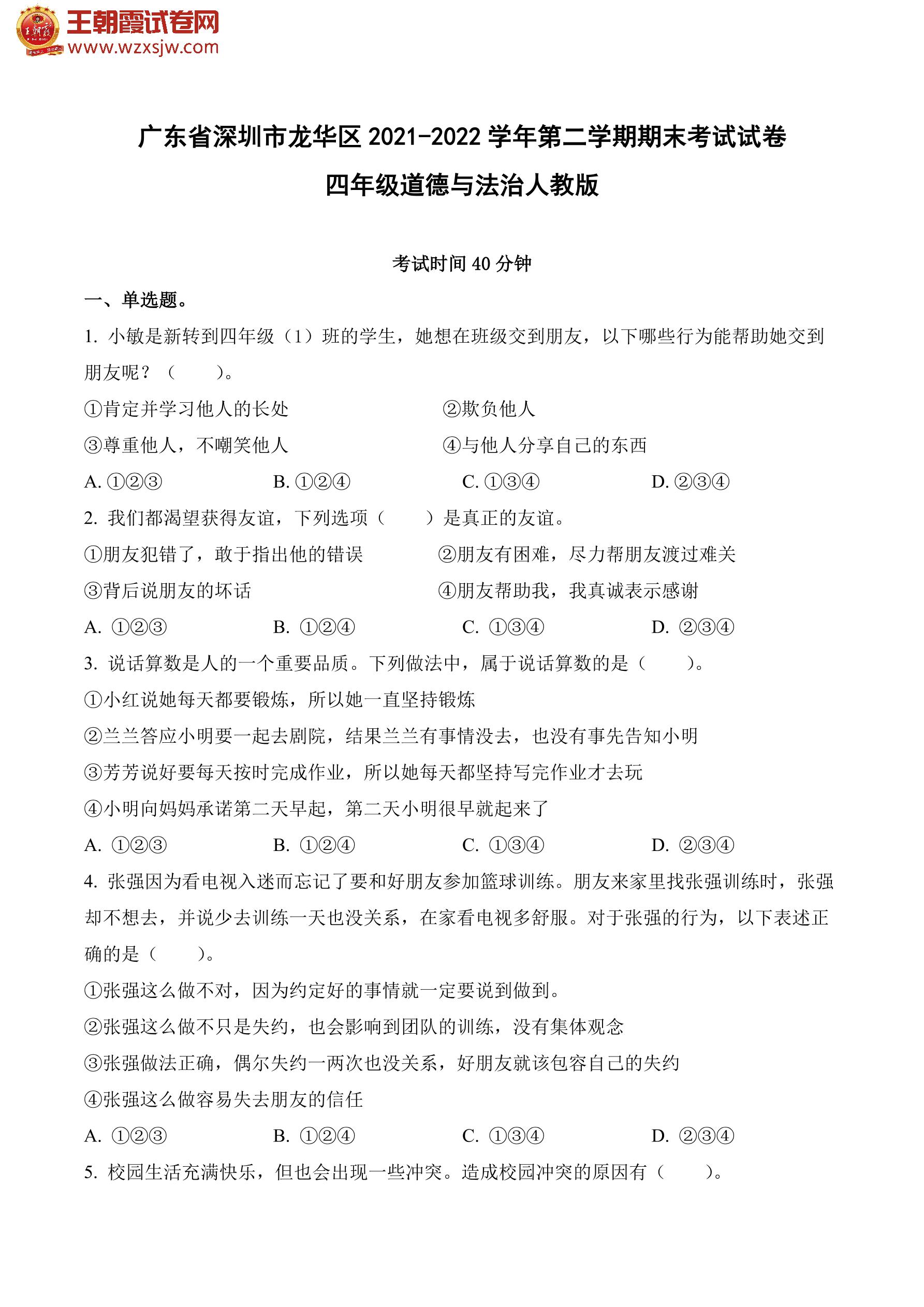 广东省深圳市龙华区2021-2022学年第二学期期末考试试卷四年级道德与法治(人教版)
