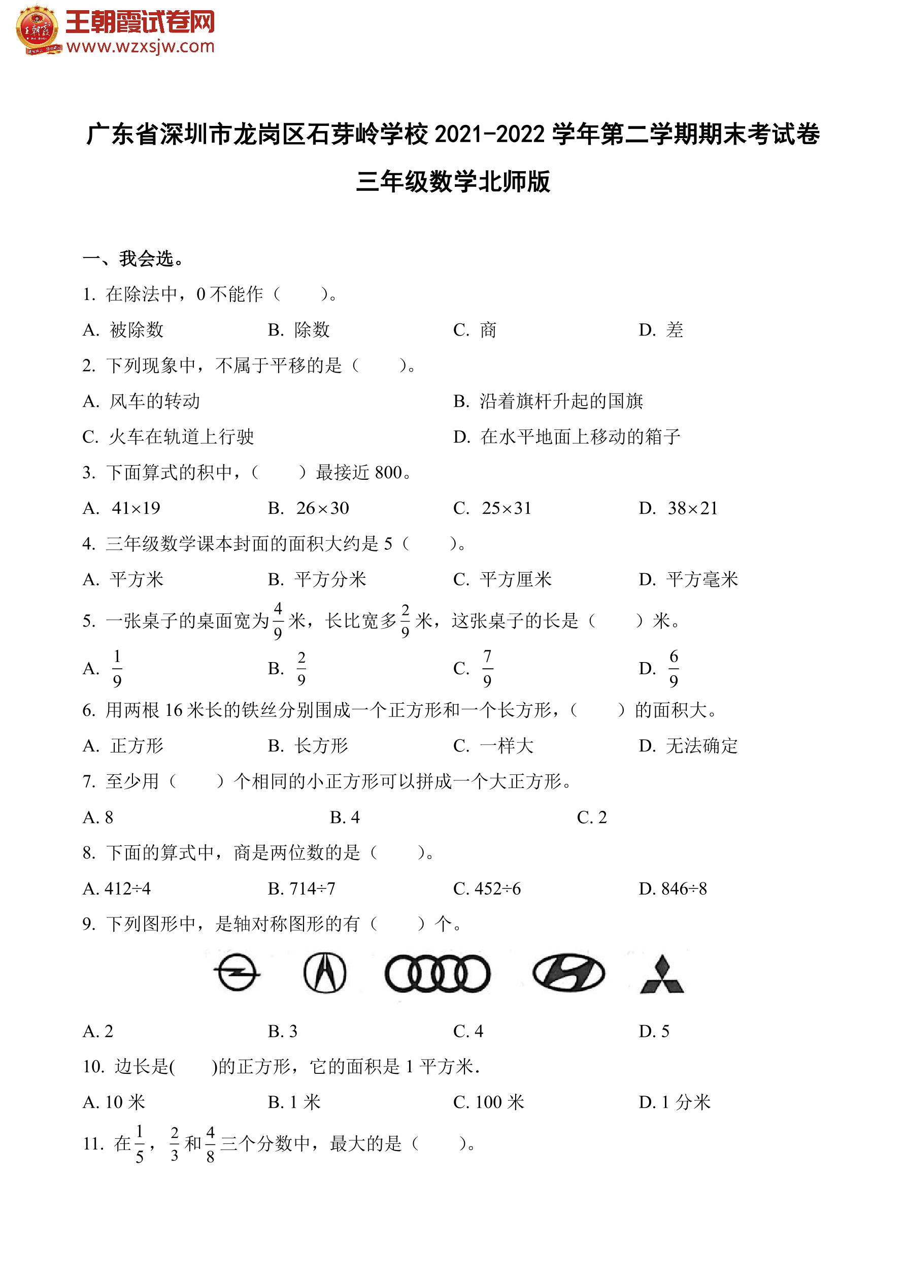 广东省深圳市龙岗区石芽岭学校2021-2022学年第二学期期末考试卷三年级数学(北师版)