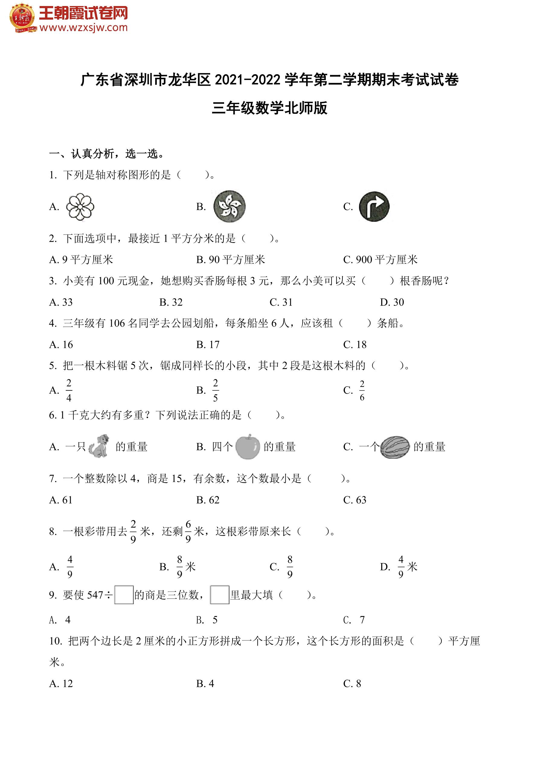 广东省深圳市龙华区2021-2022学年第二学期期末考试试卷三年级数学(北师版)