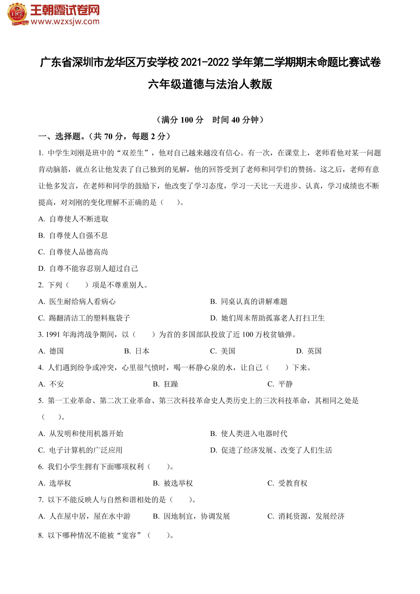 广东省深圳市龙华区万安学校2021-2022学年第二学期期末命题比赛试卷六年级道德与法治(人教版)